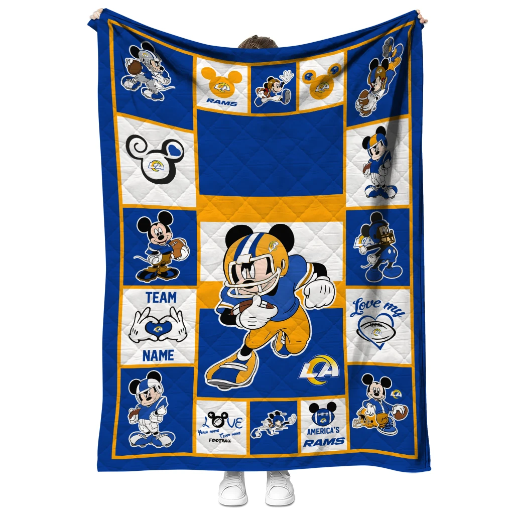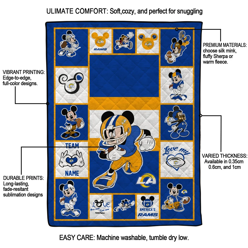 Wrap yourself in warmth and pride with the Personalized Los Angeles Rams Mickey Crimson Blue White Quilt Blanket from the Los Angeles Rams Blankets collection at Yes That Blanket. Made from 100% premium quilting-weight polyester blended with a touch of microfiber, this quilt offers a smooth, soft finish you’ll love. Choose between two quilting styles—Stipple or Diagonal—and enjoy the comfort of a cotton-filled layer inside that adds extra coziness for every season. The border is available in classic black or white, giving your design a clean, timeless edge.