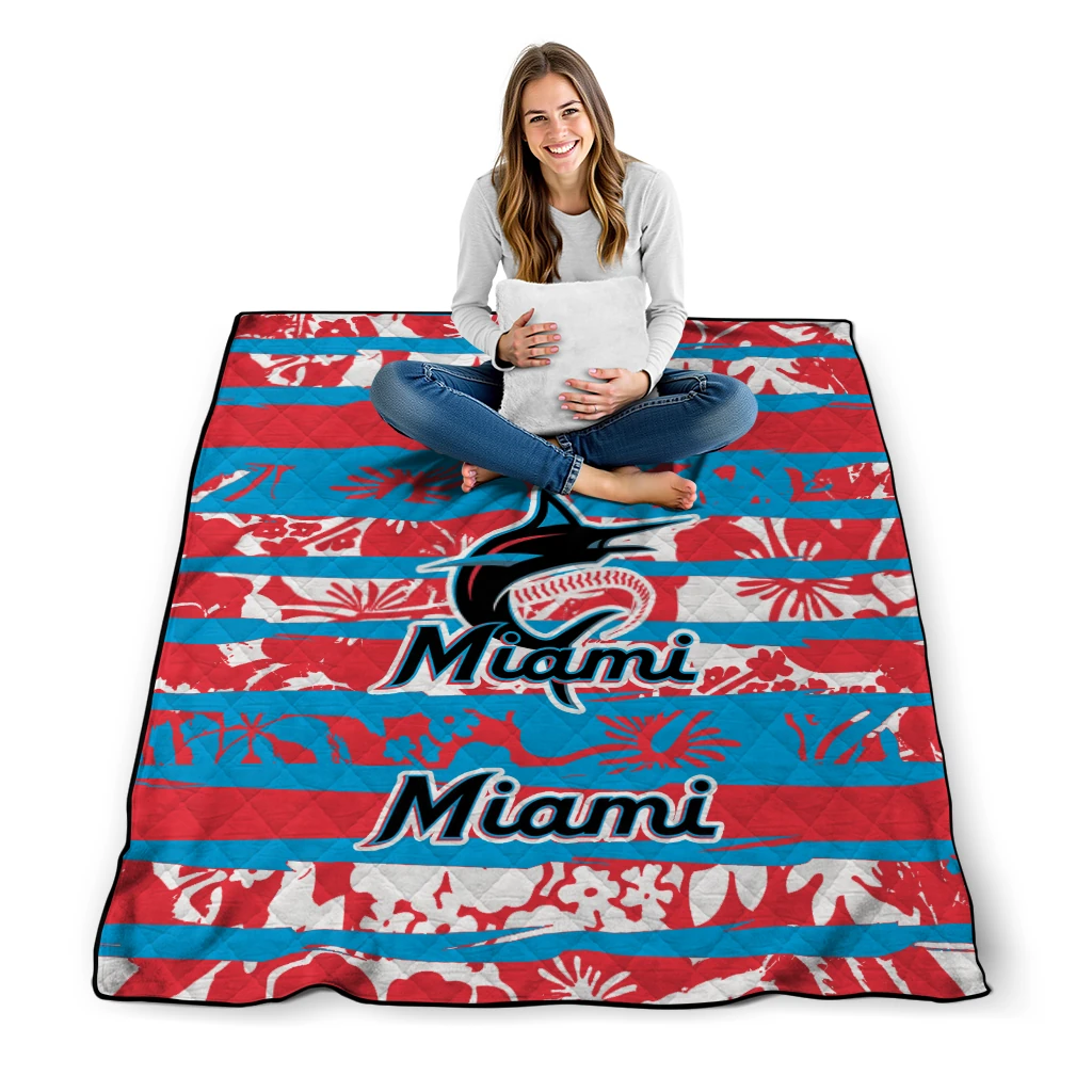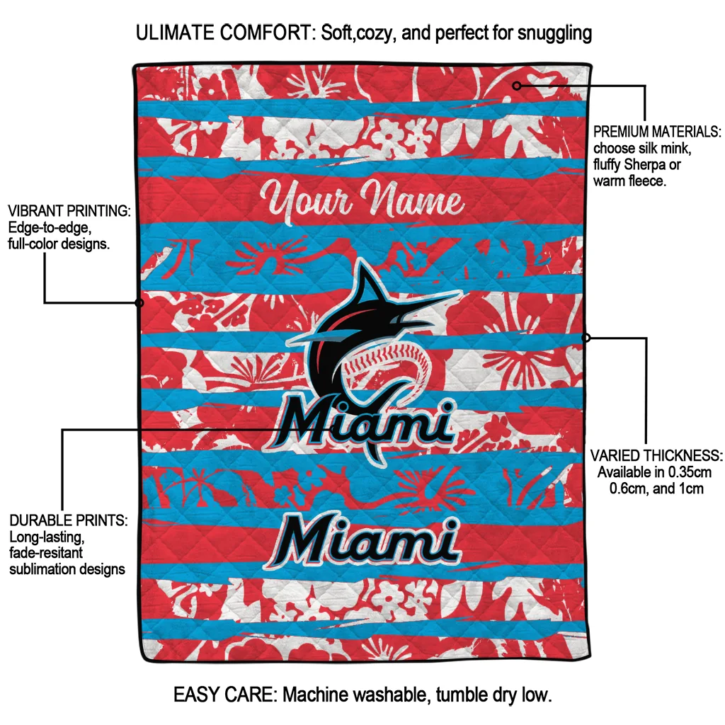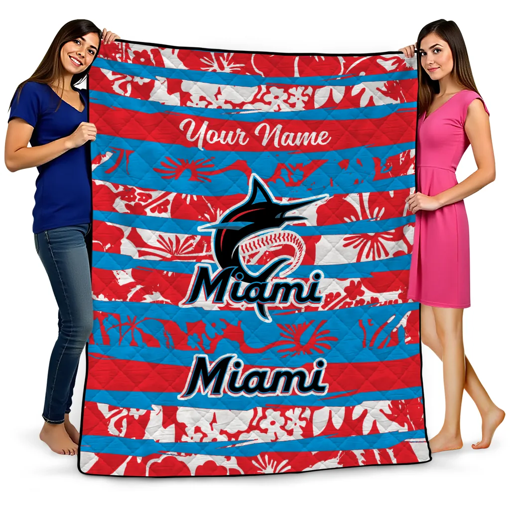 Personalized Miami Marlins Layered Florals Blue White Quilt Blanket