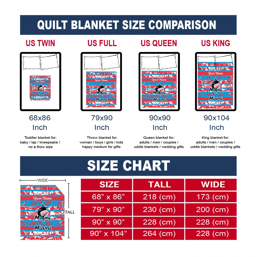 Wrap yourself in warmth and pride with the Personalized Miami Marlins Layered Florals Blue White Quilt Blanket from the Miami Marlins Blankets collection at Yes That Blanket. Made from 100% premium quilting-weight polyester blended with a touch of microfiber, this quilt offers a smooth, soft finish you’ll love. Choose between two quilting styles—Stipple or Diagonal—and enjoy the comfort of a cotton-filled layer inside that adds extra coziness for every season. The border is available in classic black or white, giving your design a clean, timeless edge.