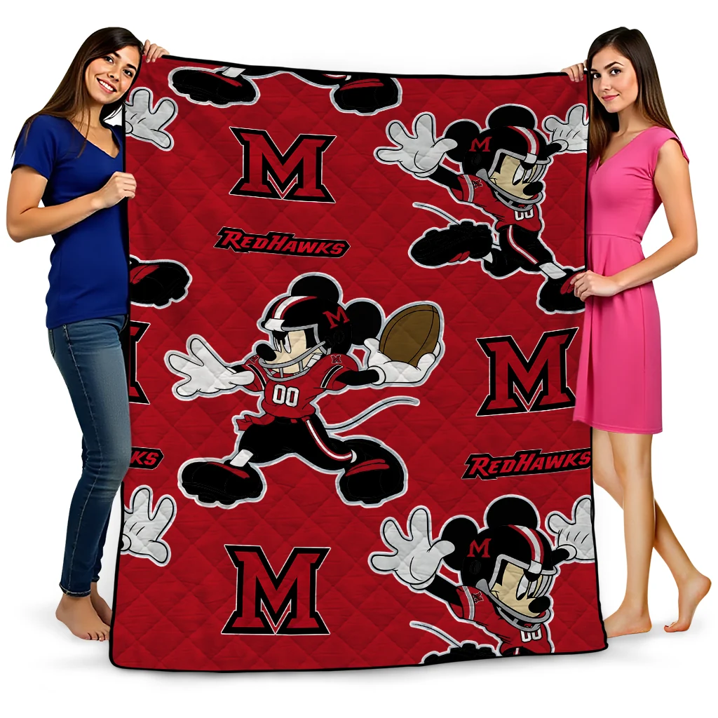 Personalized Miami RedHawks Mickey Football Red Quilt Blanket