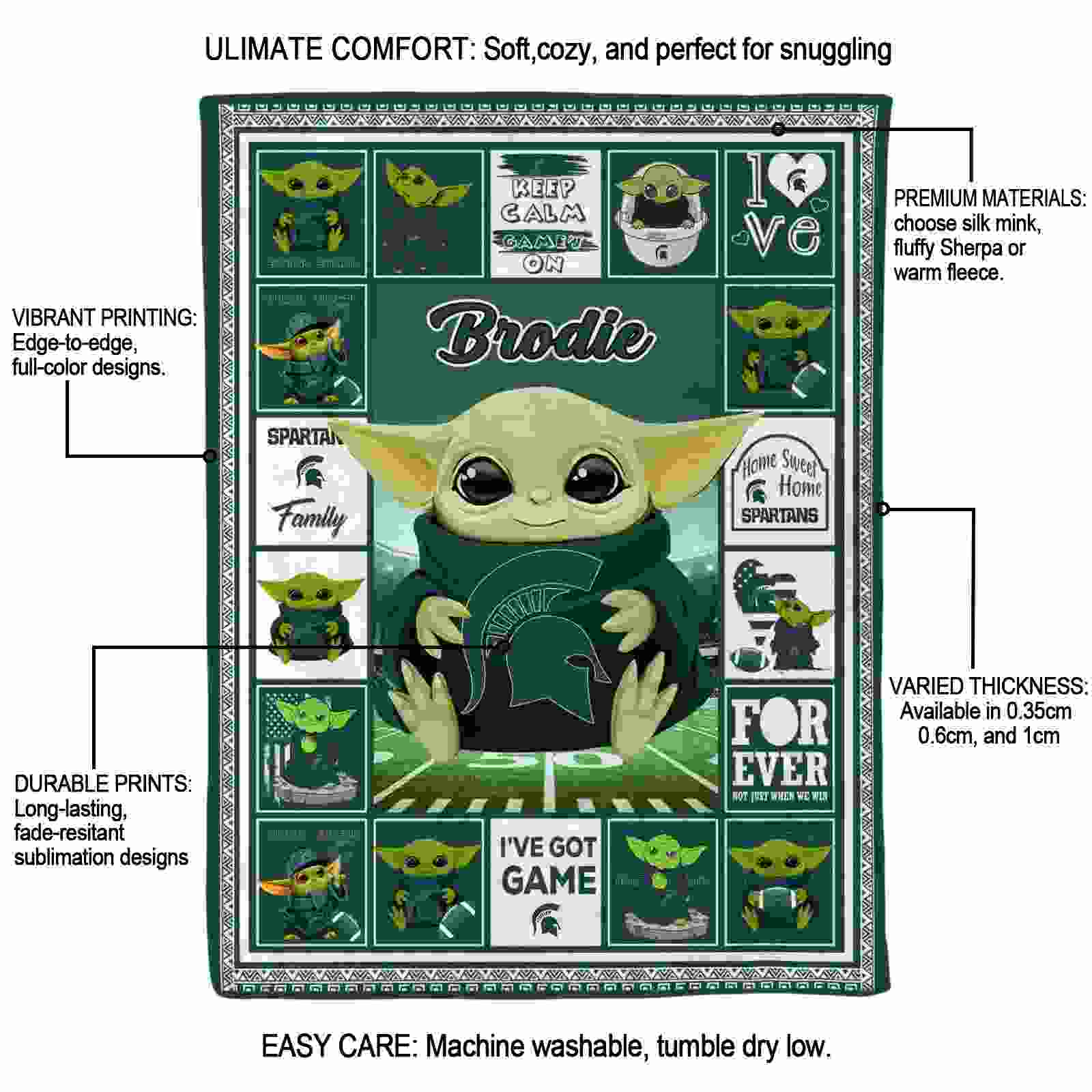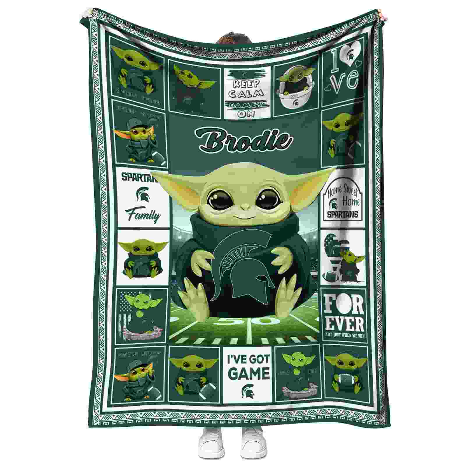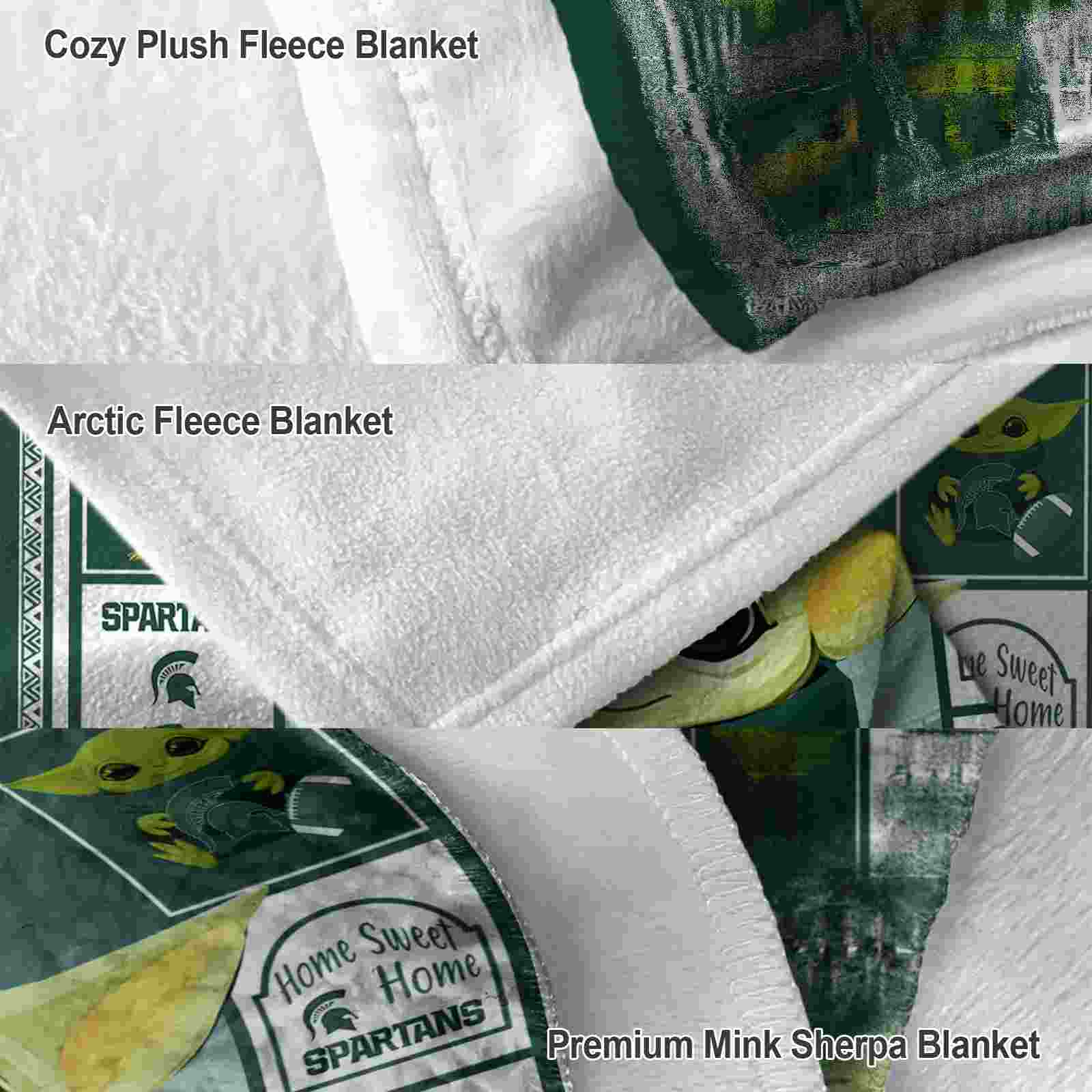 The Personalized Michigan State Spartans Baby Yoda Green Blanket isn’t just a blanket—it’s your connection to the game. Snuggle up while reliving legendary plays or dreaming of future championships. Its bold, team-inspired designs keep your love for the sport front and center, while its easy-care durability means it’s always ready for your next adventure. From cheering at home to showcasing your loyalty on the go, this item of NCAA Blankets collection is made for fans who live and breathe the game.