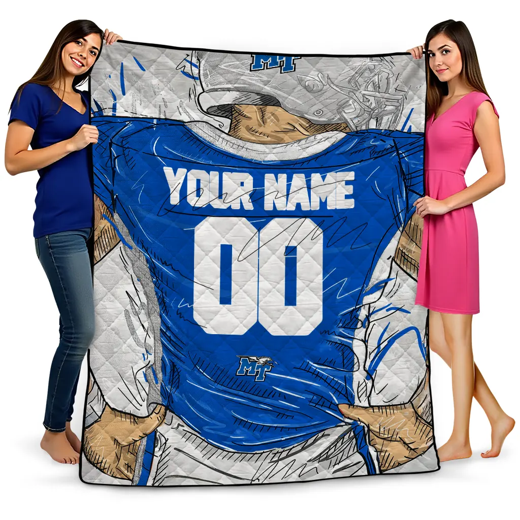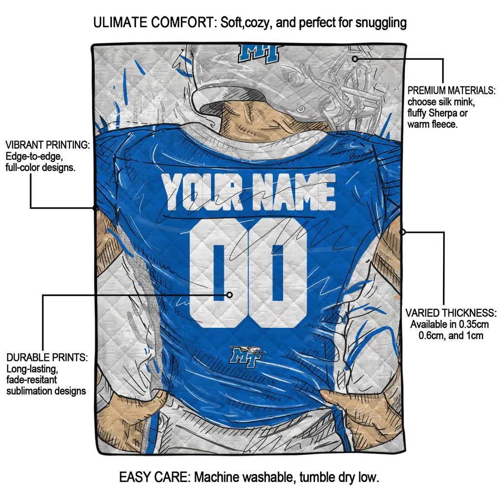 Personalized Middle Tennessee Blue Raiders Player Sketch Blue Gray Quilt Blanket