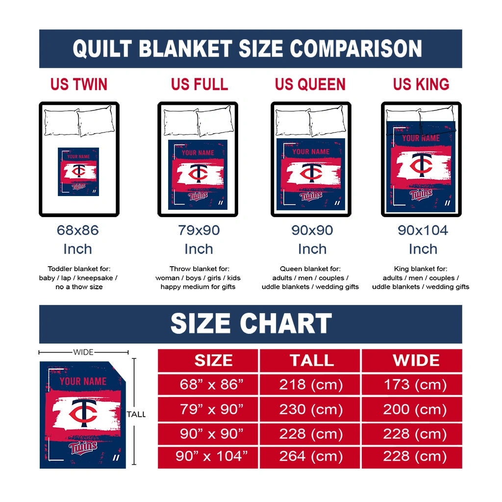 Wrap yourself in warmth and pride with the Personalized Minnesota Twins Grunge Patch Navy White Quilt Blanket from the Minnesota Twins Blankets collection at Yes That Blanket. Made from 100% premium quilting-weight polyester blended with a touch of microfiber, this quilt offers a smooth, soft finish you’ll love. Choose between two quilting styles—Stipple or Diagonal—and enjoy the comfort of a cotton-filled layer inside that adds extra coziness for every season. The border is available in classic black or white, giving your design a clean, timeless edge.