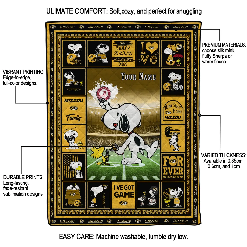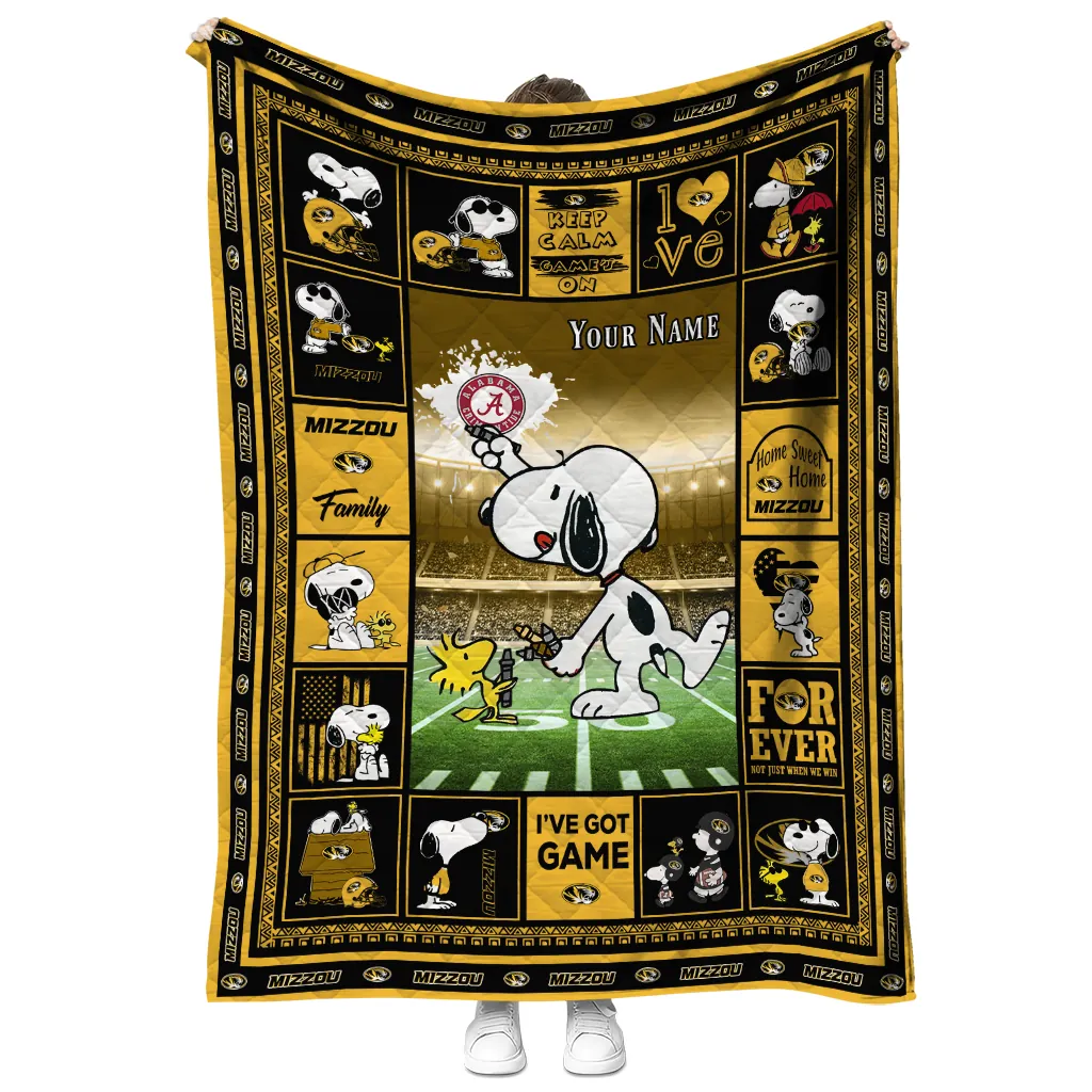 Wrap yourself in warmth and pride with the Personalized Missouri Tigers Snoopy Coach Black Quilt Blanket from the Missouri Tigers Blankets collection at Yes That Blanket. Made from 100% premium quilting-weight polyester blended with a touch of microfiber, this quilt offers a smooth, soft finish you’ll love. Choose between two quilting styles—Stipple or Diagonal—and enjoy the comfort of a cotton-filled layer inside that adds extra coziness for every season. The border is available in classic black or white, giving your design a clean, timeless edge.