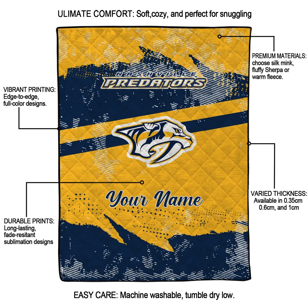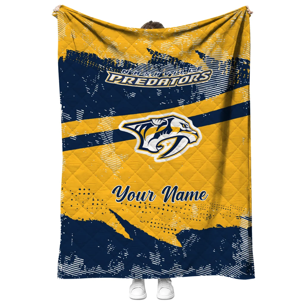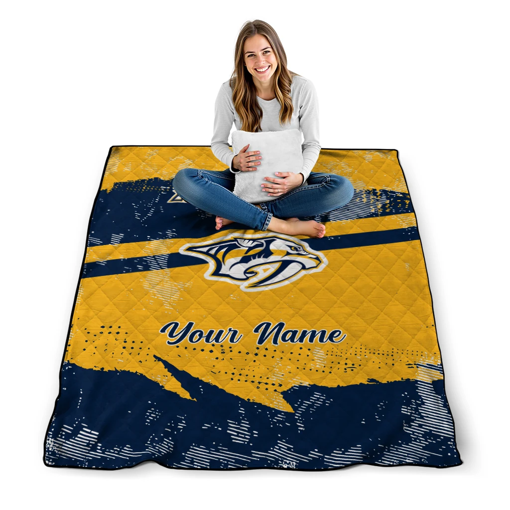 Wrap yourself in warmth and pride with the Personalized Nashville Predators Brushstroke Layers Gold Quilt Blanket from the Nashville Predators Blankets collection at Yes That Blanket. Made from 100% premium quilting-weight polyester blended with a touch of microfiber, this quilt offers a smooth, soft finish you’ll love. Choose between two quilting styles—Stipple or Diagonal—and enjoy the comfort of a cotton-filled layer inside that adds extra coziness for every season. The border is available in classic black or white, giving your design a clean, timeless edge.