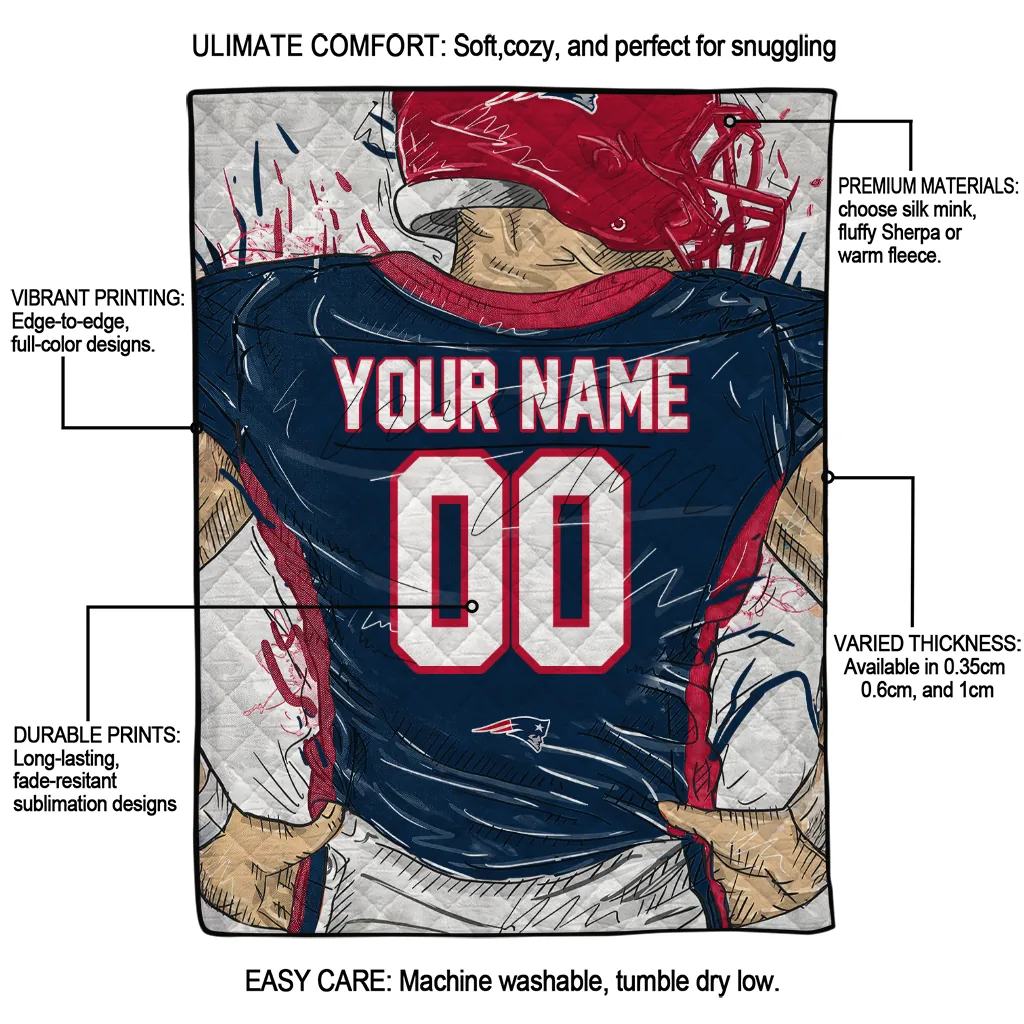 Personalized New England Patriots Player Sketch Blue Gray Quilt Blanket
