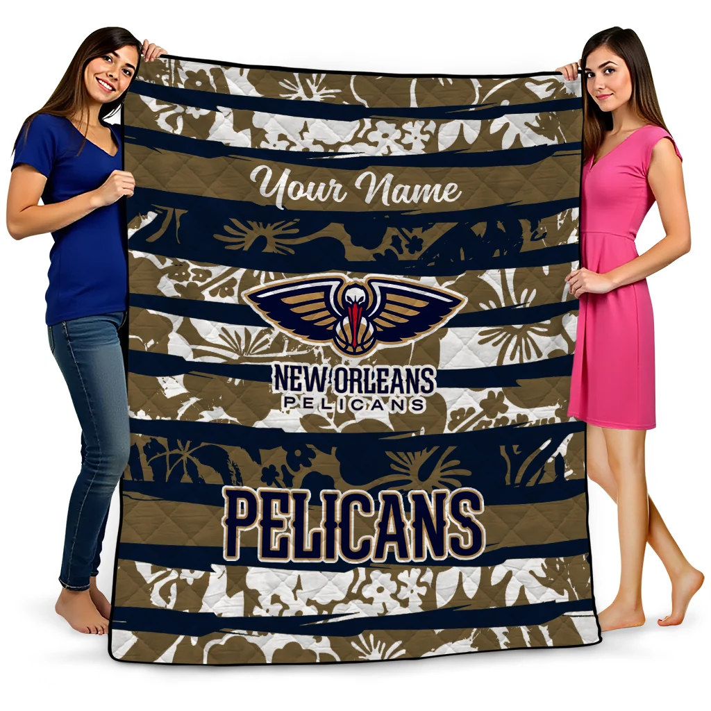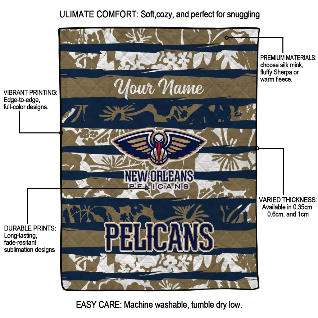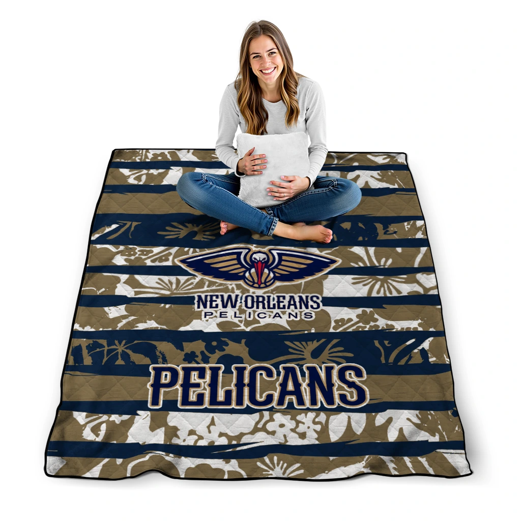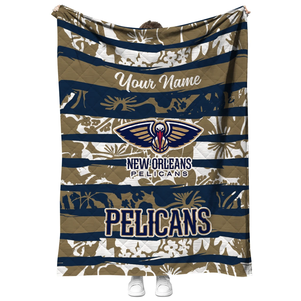 Wrap yourself in warmth and pride with the Personalized New Orleans Pelicans Layered Florals Navy White Quilt Blanket from the New Orleans Pelicans Blankets collection at Yes That Blanket. Made from 100% premium quilting-weight polyester blended with a touch of microfiber, this quilt offers a smooth, soft finish you’ll love. Choose between two quilting styles—Stipple or Diagonal—and enjoy the comfort of a cotton-filled layer inside that adds extra coziness for every season. The border is available in classic black or white, giving your design a clean, timeless edge.