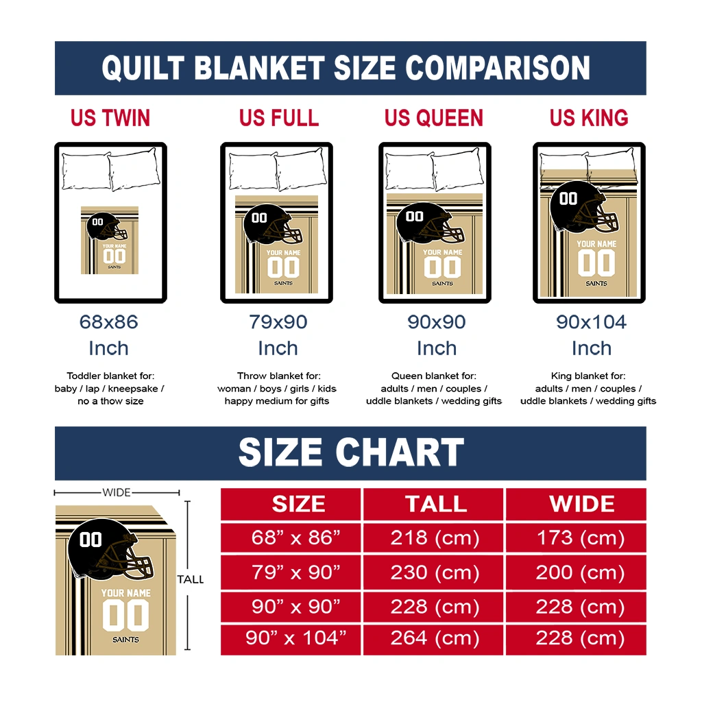 Wrap yourself in warmth and pride with the Personalized New Orleans Saints Helmet Theme Gold Quilt Blanket from the New Orleans Saints Blankets collection at Yes That Blanket. Made from 100% premium quilting-weight polyester blended with a touch of microfiber, this quilt offers a smooth, soft finish you’ll love. Choose between two quilting styles—Stipple or Diagonal—and enjoy the comfort of a cotton-filled layer inside that adds extra coziness for every season. The border is available in classic black or white, giving your design a clean, timeless edge.