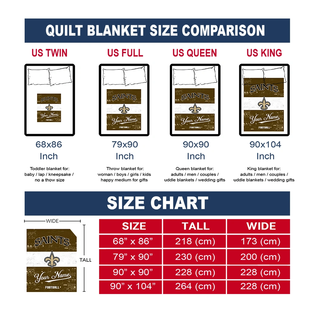 Wrap yourself in warmth and pride with the Personalized New Orleans Saints Hibiscus Burst Gold White Quilt Blanket from the New Orleans Saints Blankets collection at Yes That Blanket. Made from 100% premium quilting-weight polyester blended with a touch of microfiber, this quilt offers a smooth, soft finish you’ll love. Choose between two quilting styles—Stipple or Diagonal—and enjoy the comfort of a cotton-filled layer inside that adds extra coziness for every season. The border is available in classic black or white, giving your design a clean, timeless edge.