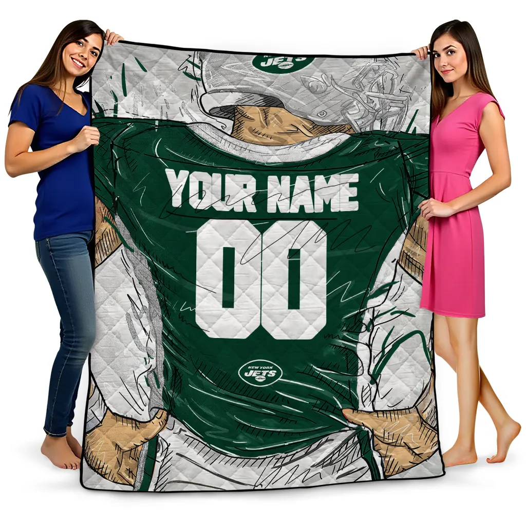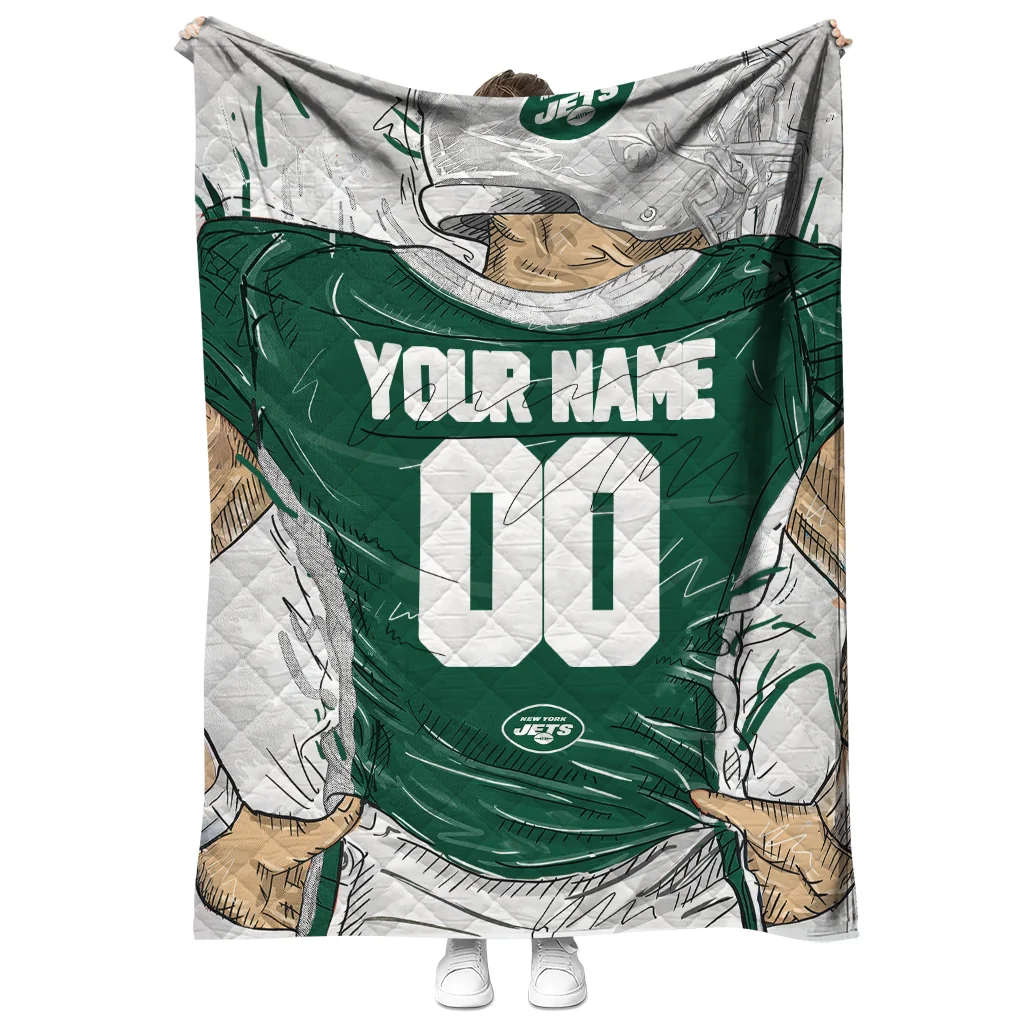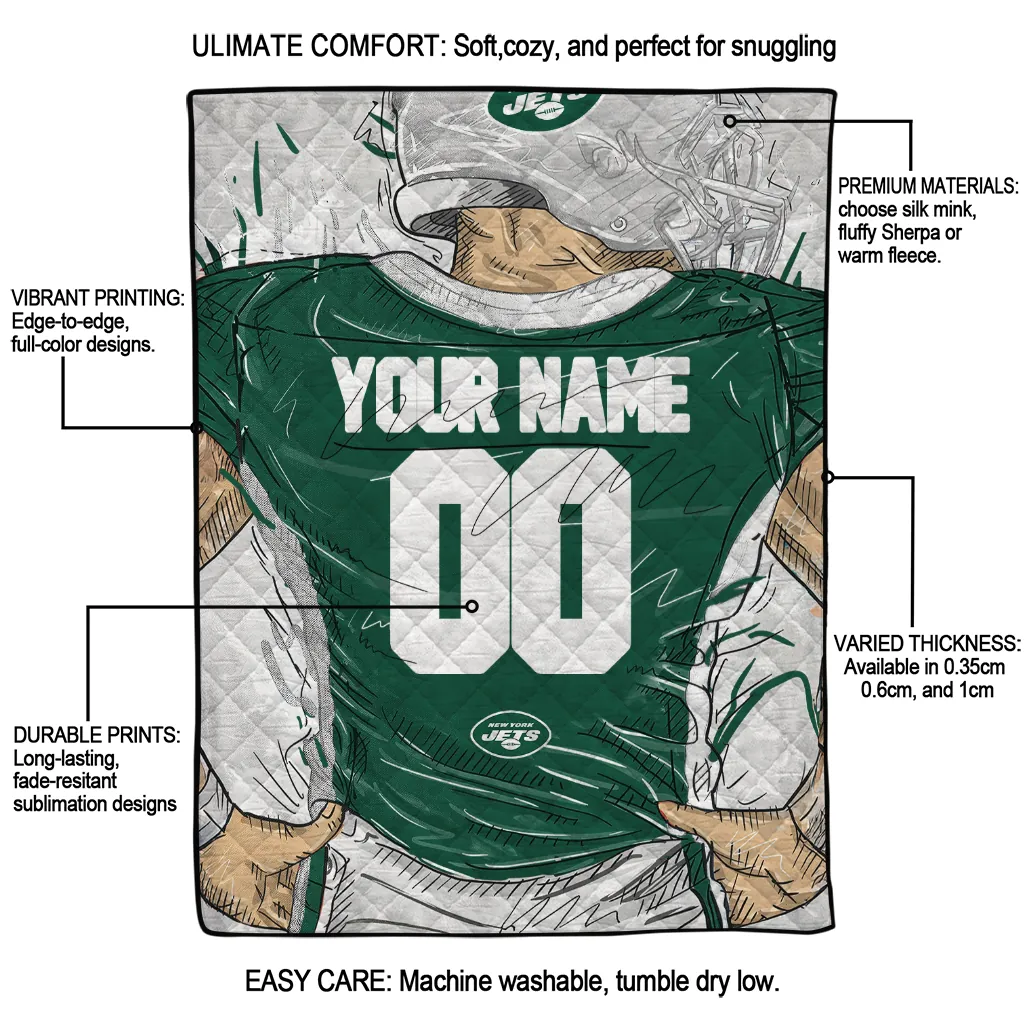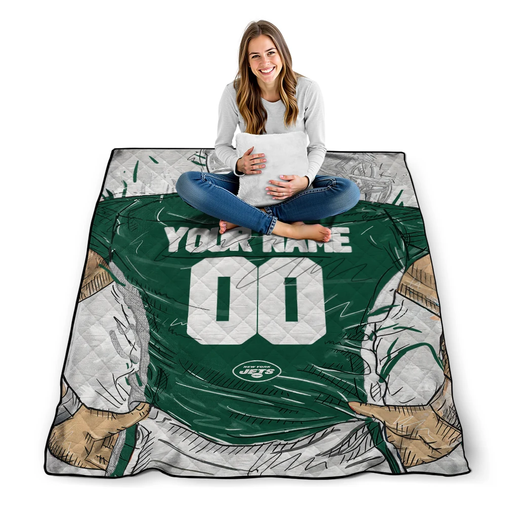 The Personalized New York Jets Player Sketch Green Gray Quilt Blanket is more than a blanket—it’s everyday comfort, thoughtfully made. Crafted from premium quilting fabric with a soft microfiber touch, it offers a smooth hand-feel and lasting coziness. Layered quilting with a cotton-filled core provides adaptable warmth across seasons while maintaining a clean, tailored look on your bed or sofa.