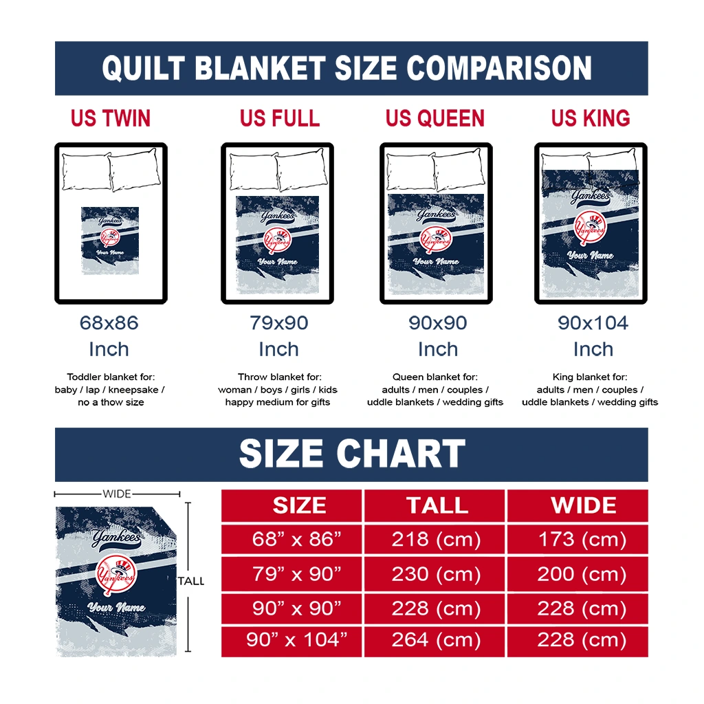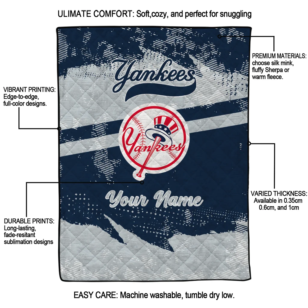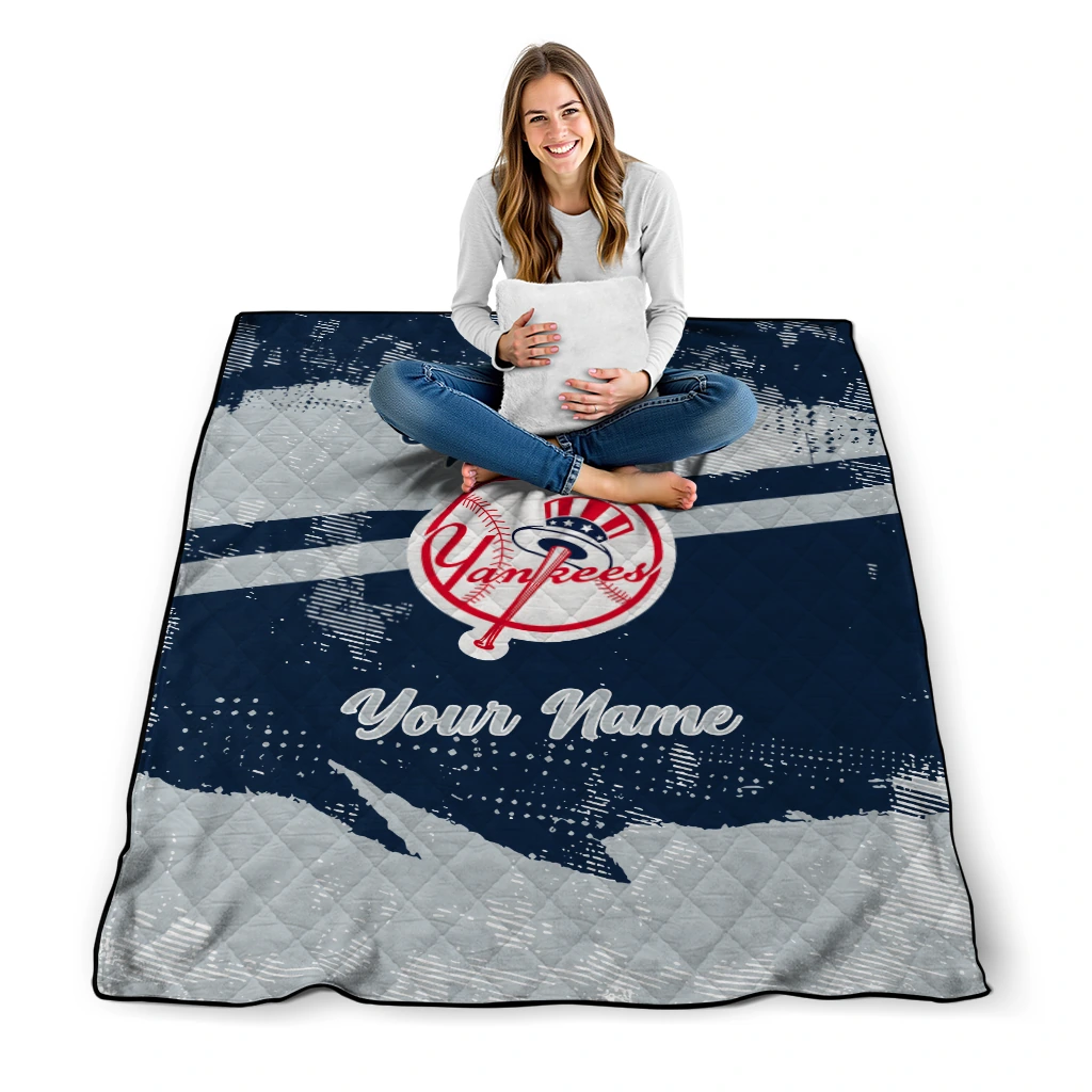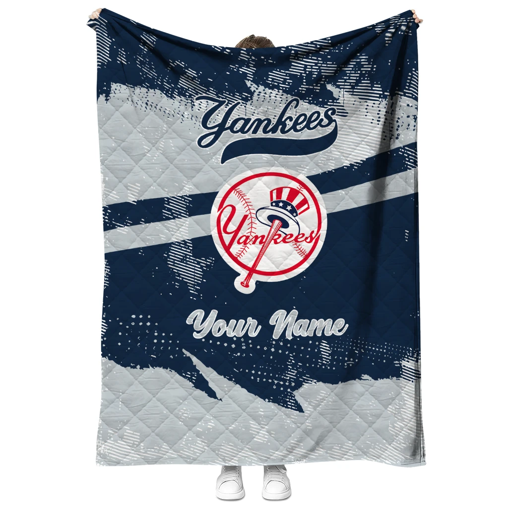 Wrap yourself in warmth and pride with the Personalized New York Yankees Brushstroke Layers Navy Quilt Blanket from the New York Yankees Blankets collection at Yes That Blanket. Made from 100% premium quilting-weight polyester blended with a touch of microfiber, this quilt offers a smooth, soft finish you’ll love. Choose between two quilting styles—Stipple or Diagonal—and enjoy the comfort of a cotton-filled layer inside that adds extra coziness for every season. The border is available in classic black or white, giving your design a clean, timeless edge.