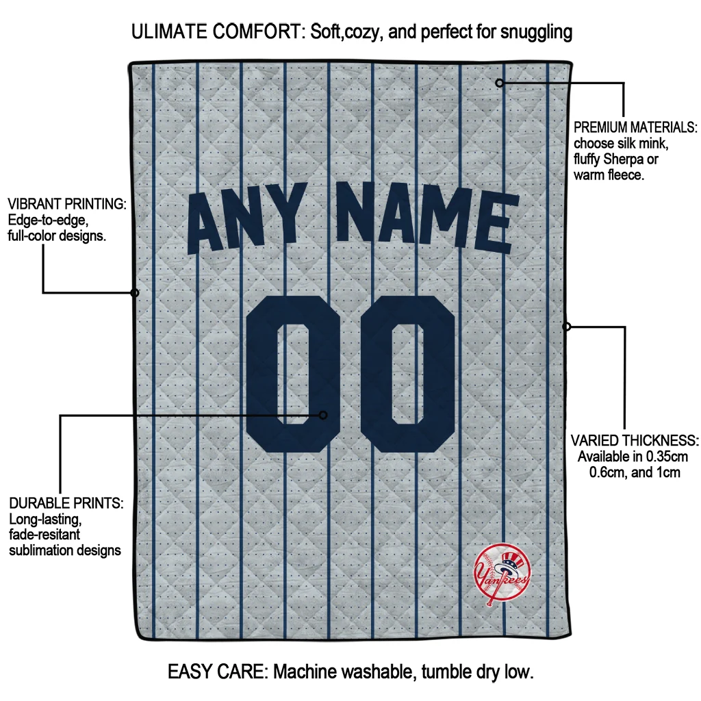 Wrap yourself in warmth and pride with the Personalized New York Yankees Pin Dot Quilt Blanket from the New York Yankees Blankets collection at Yes That Blanket. Made from 100% premium quilting-weight polyester blended with a touch of microfiber, this quilt offers a smooth, soft finish you’ll love. Choose between two quilting styles—Stipple or Diagonal—and enjoy the comfort of a cotton-filled layer inside that adds extra coziness for every season. The border is available in classic black or white, giving your design a clean, timeless edge.