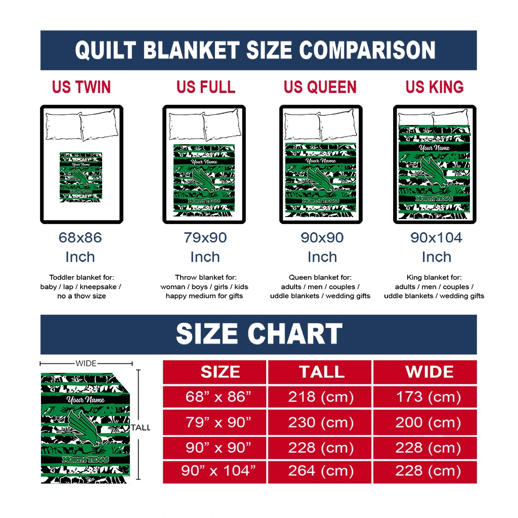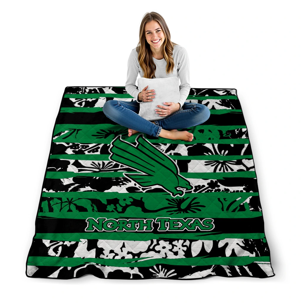 The Personalized North Texas Mean Green Layered Florals Green White Quilt Blanket is more than a blanket—it’s everyday comfort, thoughtfully made. Crafted from premium quilting fabric with a soft microfiber touch, it offers a smooth hand-feel and lasting coziness. Layered quilting with a cotton-filled core provides adaptable warmth across seasons while maintaining a clean, tailored look on your bed or sofa.