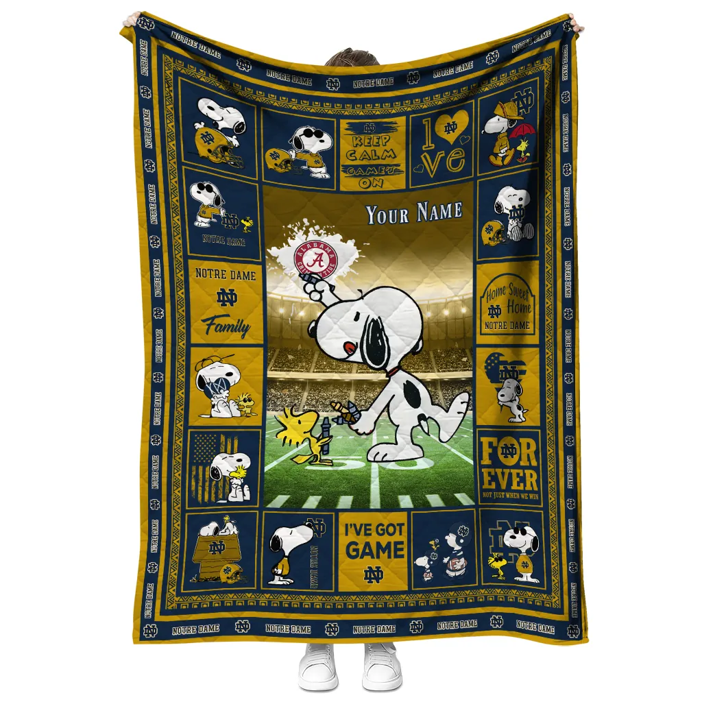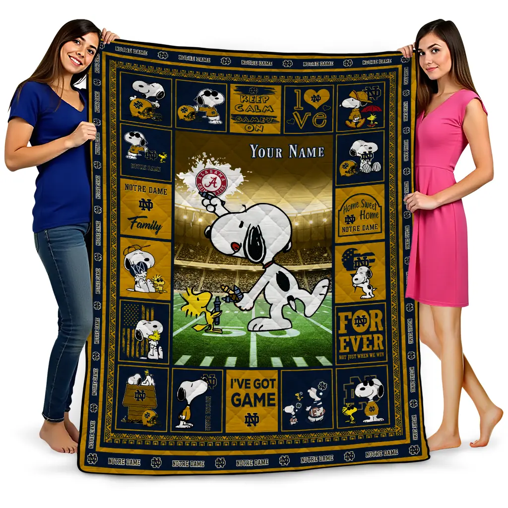 Wrap yourself in warmth and pride with the Personalized Notre Dame Fighting Irish Snoopy Coach Navy Quilt Blanket from the Notre Dame Fighting Irish Blankets collection at Yes That Blanket. Made from 100% premium quilting-weight polyester blended with a touch of microfiber, this quilt offers a smooth, soft finish you’ll love. Choose between two quilting styles—Stipple or Diagonal—and enjoy the comfort of a cotton-filled layer inside that adds extra coziness for every season. The border is available in classic black or white, giving your design a clean, timeless edge.