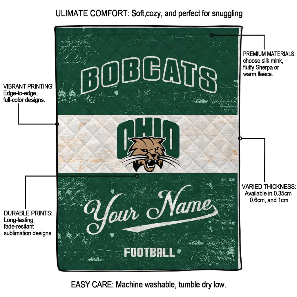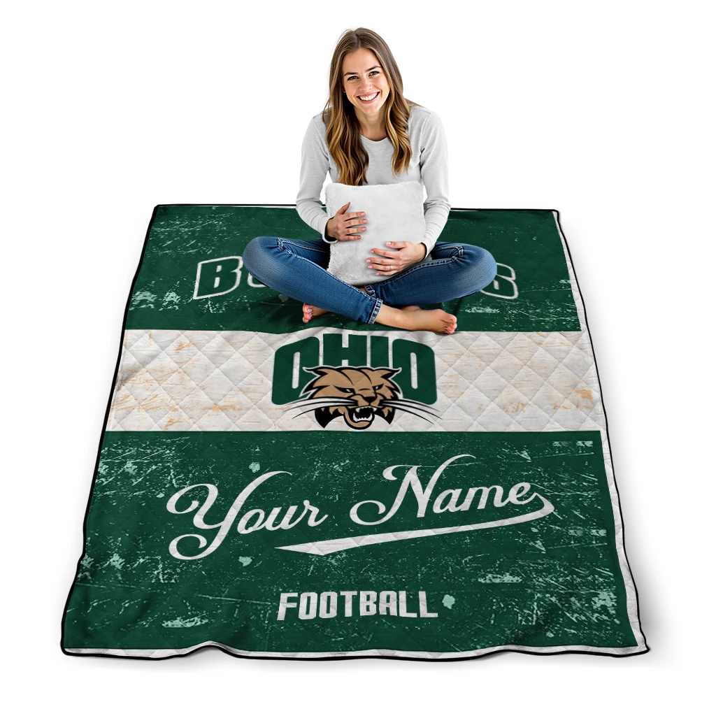 Wrap yourself in warmth and pride with the Personalized Ohio Bobcats Hibiscus Burst Green White Quilt Blanket from the Ohio Bobcats Blankets collection at Yes That Blanket. Made from 100% premium quilting-weight polyester blended with a touch of microfiber, this quilt offers a smooth, soft finish you’ll love. Choose between two quilting styles—Stipple or Diagonal—and enjoy the comfort of a cotton-filled layer inside that adds extra coziness for every season. The border is available in classic black or white, giving your design a clean, timeless edge.