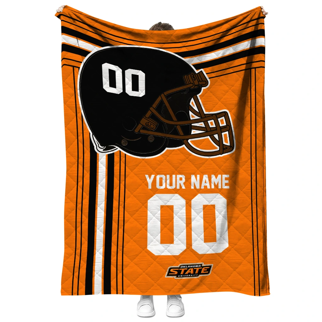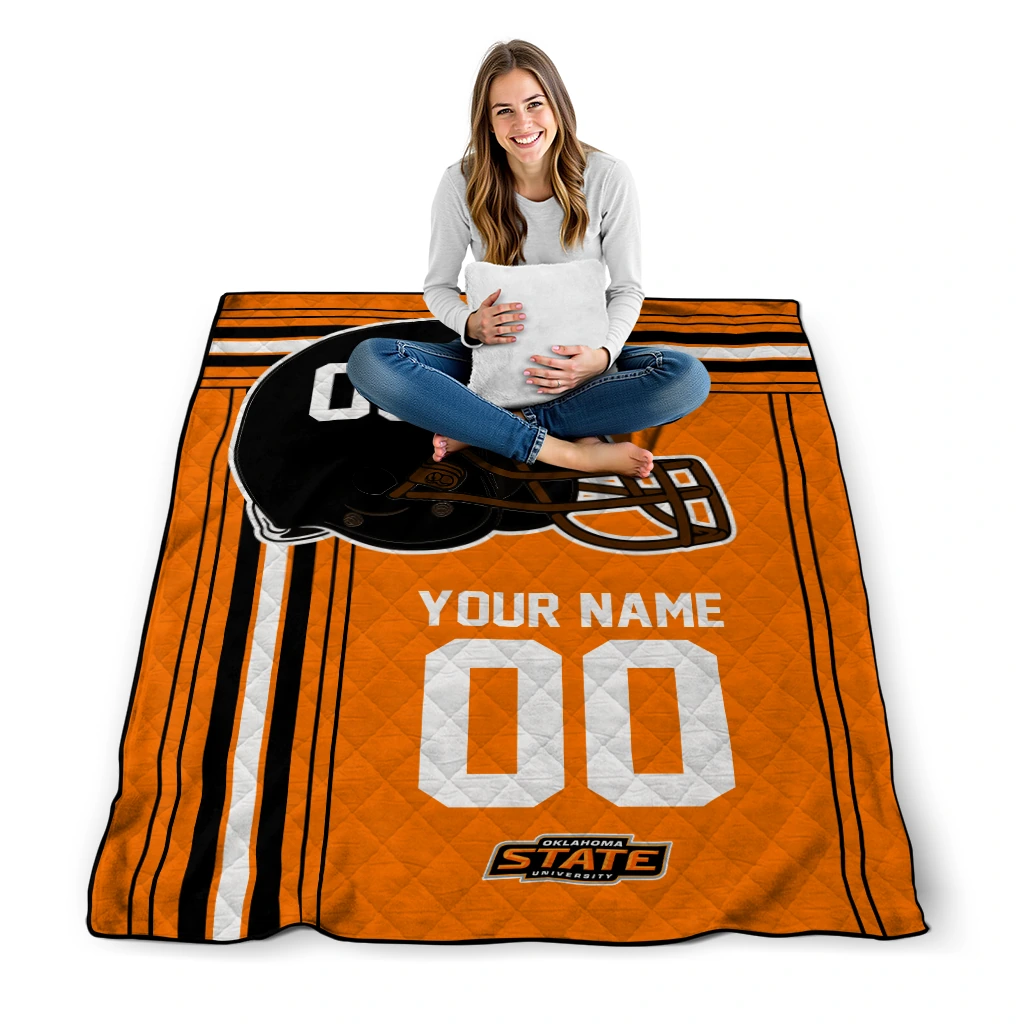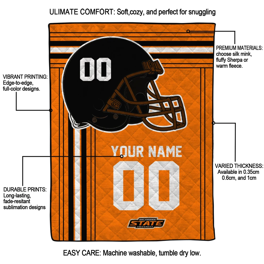 Wrap yourself in warmth and pride with the Personalized Oklahoma State Cowboys Helmet Theme Orange Quilt Blanket from the Oklahoma State Cowboys Blankets collection at Yes That Blanket. Made from 100% premium quilting-weight polyester blended with a touch of microfiber, this quilt offers a smooth, soft finish you’ll love. Choose between two quilting styles—Stipple or Diagonal—and enjoy the comfort of a cotton-filled layer inside that adds extra coziness for every season. The border is available in classic black or white, giving your design a clean, timeless edge.