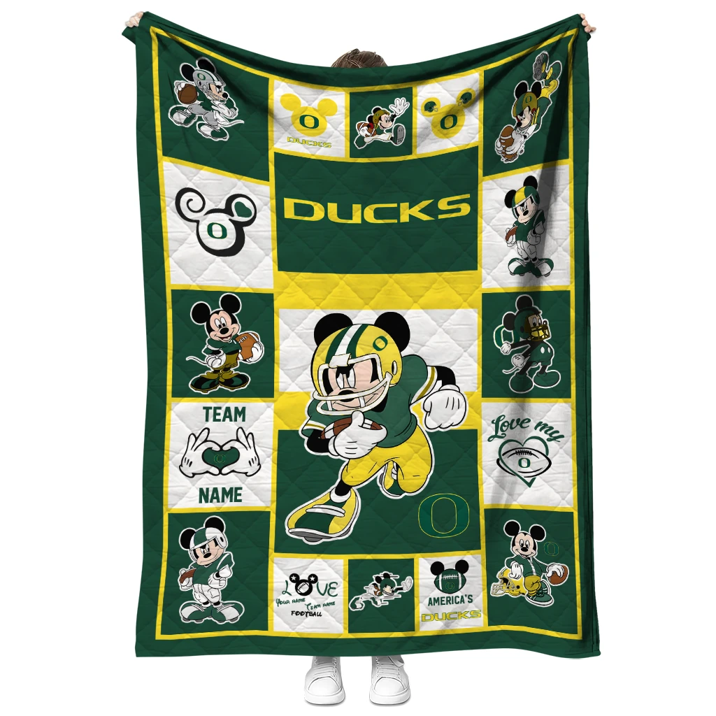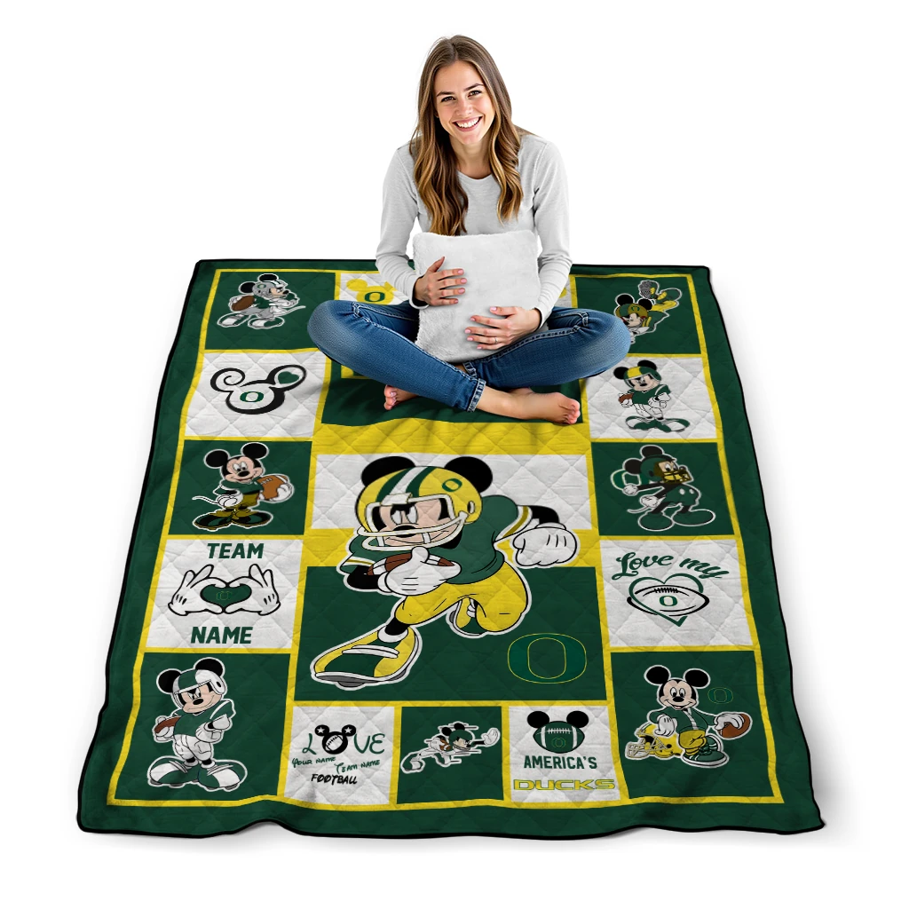 Wrap yourself in warmth and pride with the Personalized Oregon Ducks Mickey Crimson Green White Quilt Blanket from the Oregon Ducks Blankets collection at Yes That Blanket. Made from 100% premium quilting-weight polyester blended with a touch of microfiber, this quilt offers a smooth, soft finish you’ll love. Choose between two quilting styles—Stipple or Diagonal—and enjoy the comfort of a cotton-filled layer inside that adds extra coziness for every season. The border is available in classic black or white, giving your design a clean, timeless edge.
