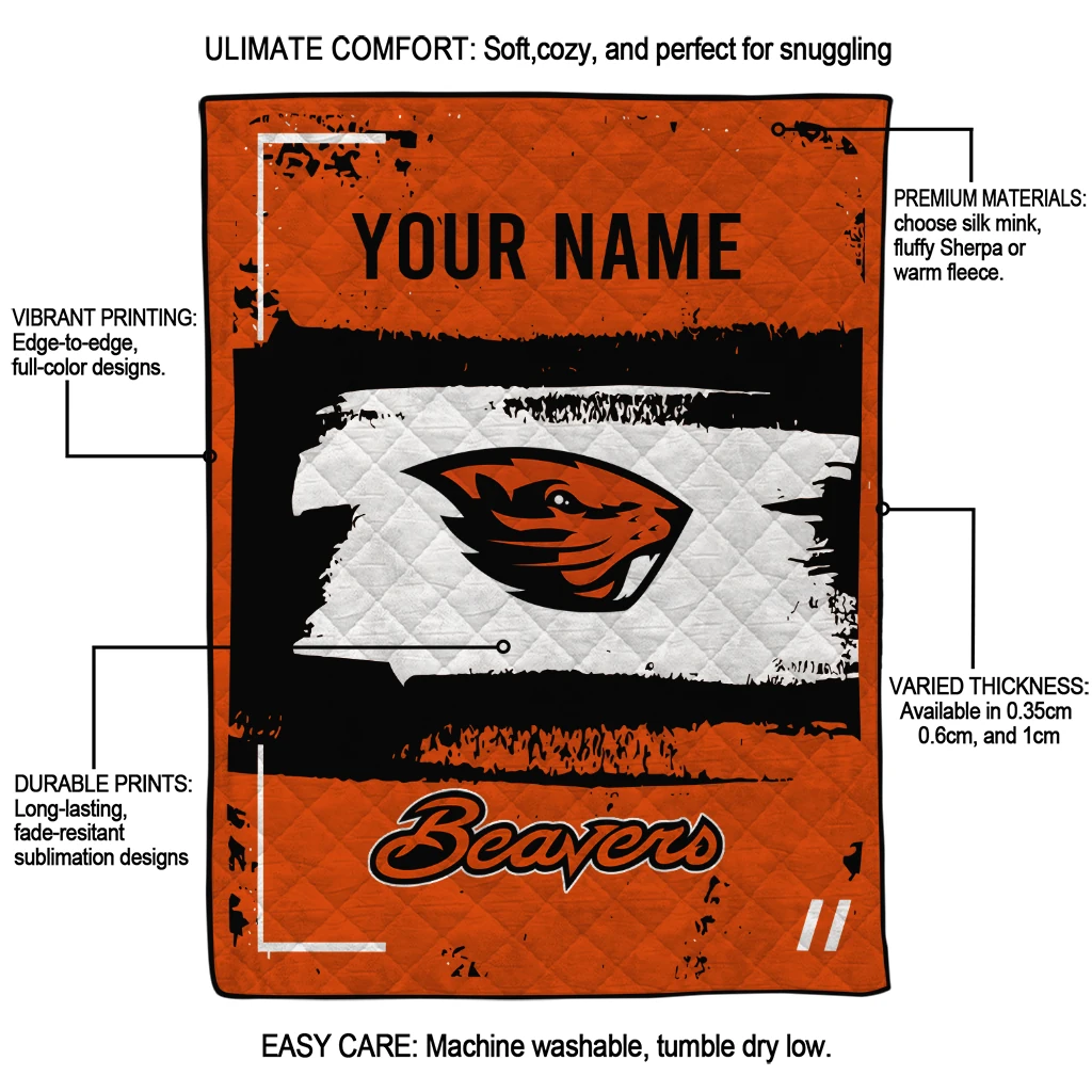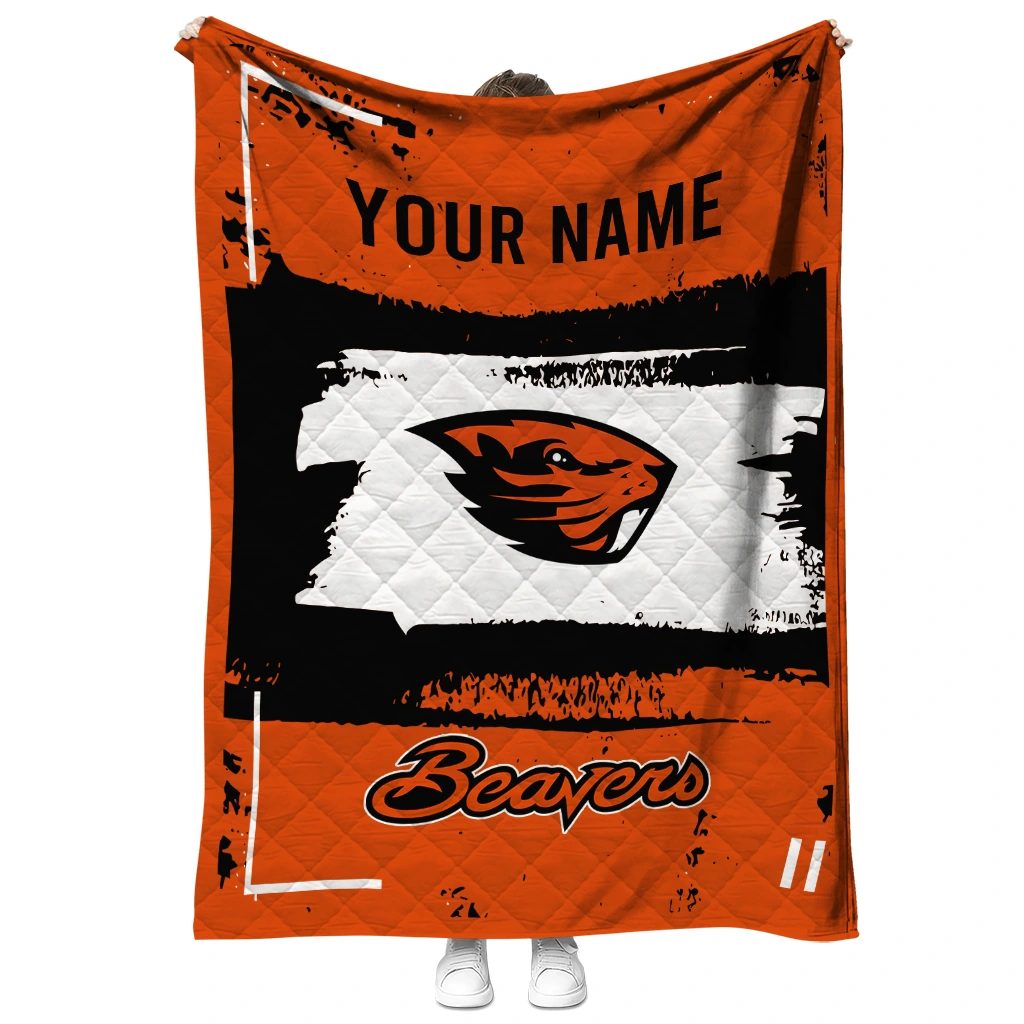 Wrap yourself in warmth and pride with the Personalized Oregon State Beavers Grunge Patch Orange White Quilt Blanket from the Oregon State Beavers Blankets collection at Yes That Blanket. Made from 100% premium quilting-weight polyester blended with a touch of microfiber, this quilt offers a smooth, soft finish you’ll love. Choose between two quilting styles—Stipple or Diagonal—and enjoy the comfort of a cotton-filled layer inside that adds extra coziness for every season. The border is available in classic black or white, giving your design a clean, timeless edge.