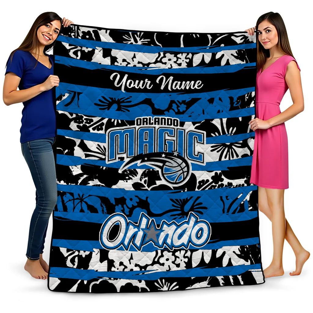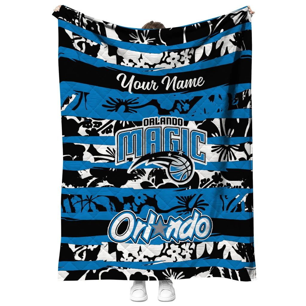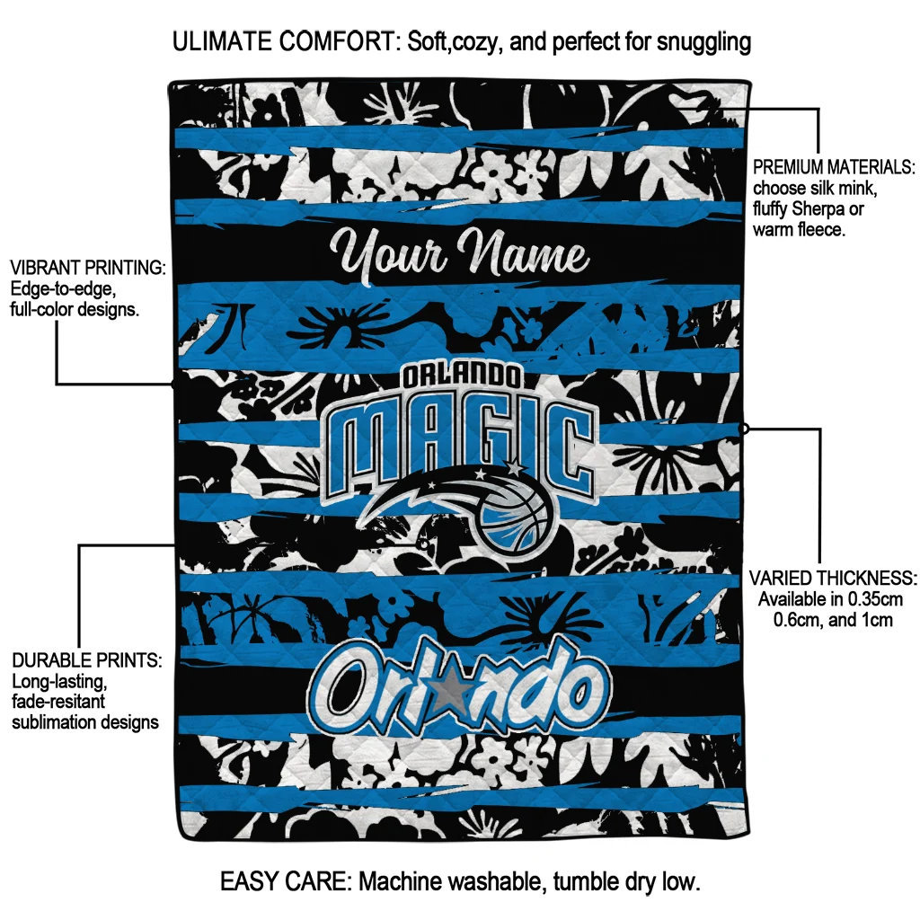 Wrap yourself in warmth and pride with the Personalized Orlando Magic Layered Florals Blue White Quilt Blanket from the Orlando Magic Blankets collection at Yes That Blanket. Made from 100% premium quilting-weight polyester blended with a touch of microfiber, this quilt offers a smooth, soft finish you’ll love. Choose between two quilting styles—Stipple or Diagonal—and enjoy the comfort of a cotton-filled layer inside that adds extra coziness for every season. The border is available in classic black or white, giving your design a clean, timeless edge.