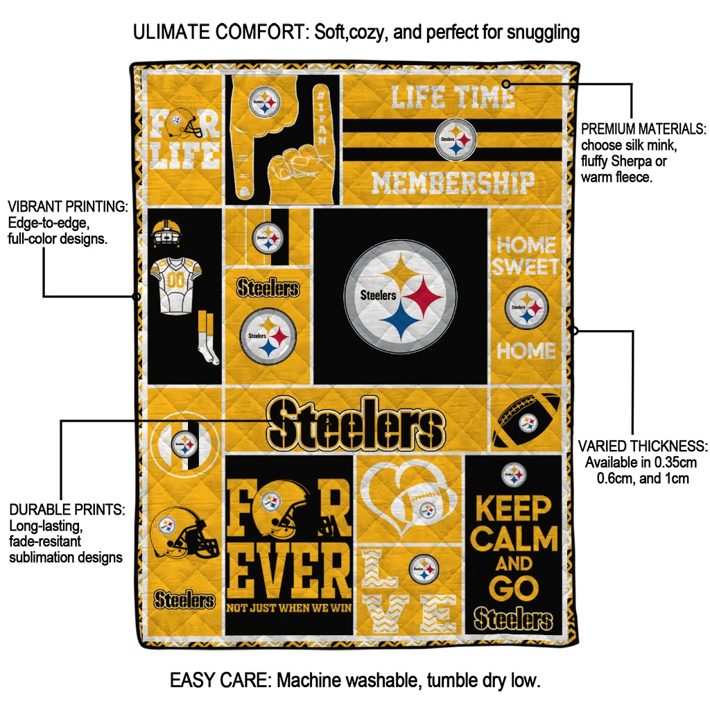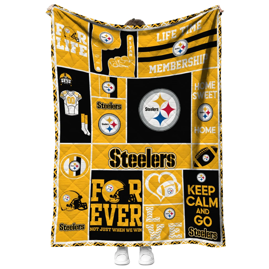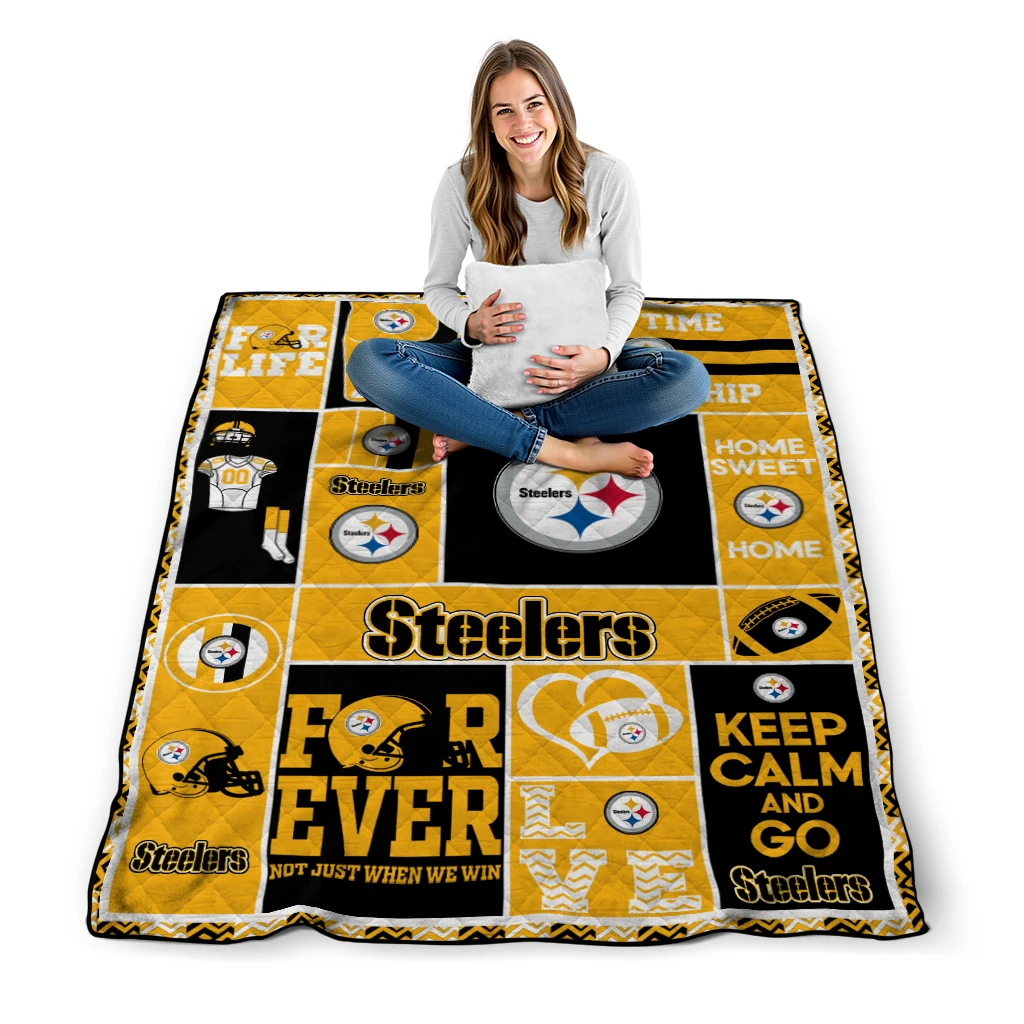 The Personalized Pittsburgh Steelers Helmet Passion Gold Quilt Blanket is more than a blanket—it’s everyday comfort, thoughtfully made. Crafted from premium quilting fabric with a soft microfiber touch, it offers a smooth hand-feel and lasting coziness. Layered quilting with a cotton-filled core provides adaptable warmth across seasons while maintaining a clean, tailored look on your bed or sofa.