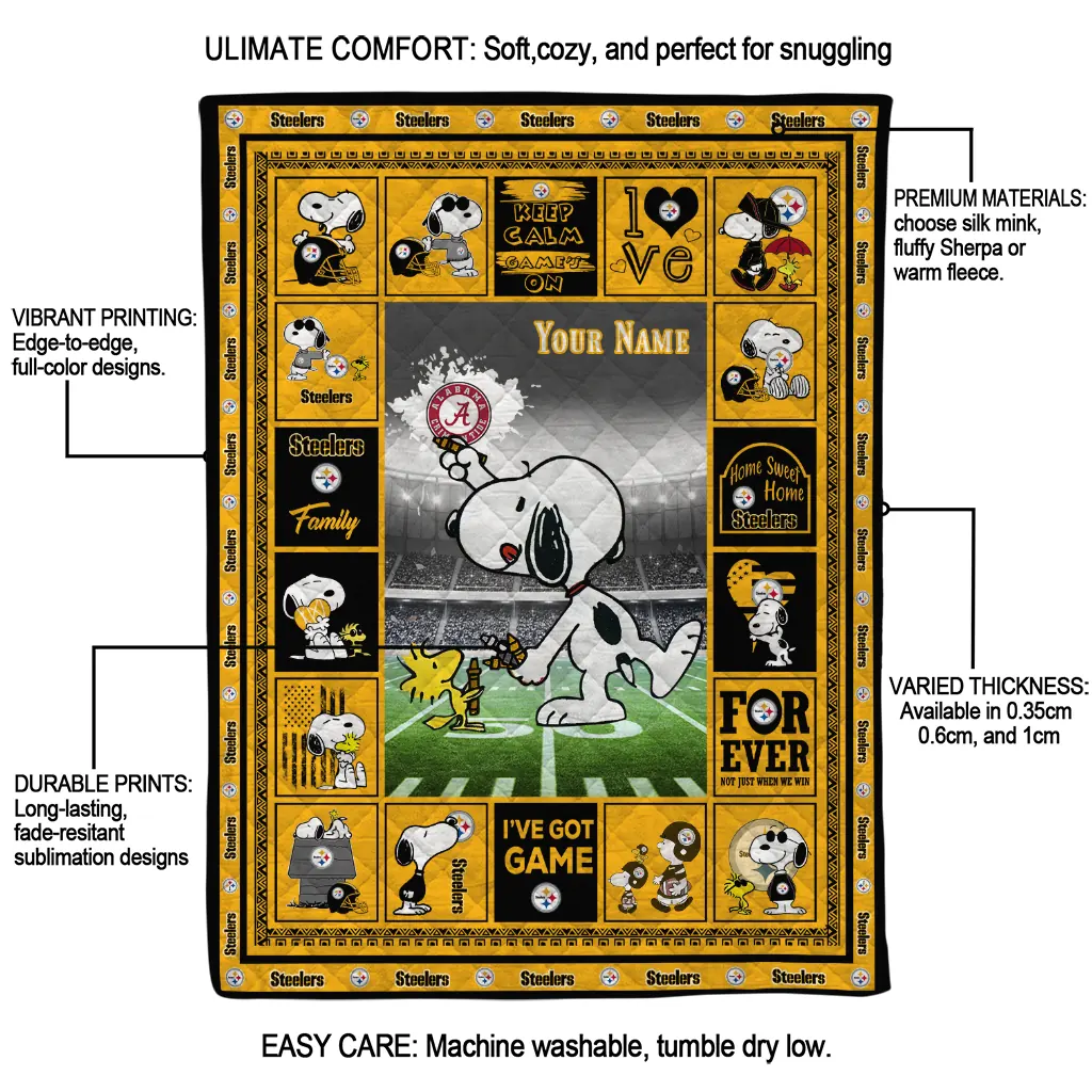 Wrap yourself in warmth and pride with the Personalized Pittsburgh Steelers Snoopy Coach Gold Quilt Blanket from the Pittsburgh Steelers Blankets collection at Yes That Blanket. Made from 100% premium quilting-weight polyester blended with a touch of microfiber, this quilt offers a smooth, soft finish you’ll love. Choose between two quilting styles—Stipple or Diagonal—and enjoy the comfort of a cotton-filled layer inside that adds extra coziness for every season. The border is available in classic black or white, giving your design a clean, timeless edge.