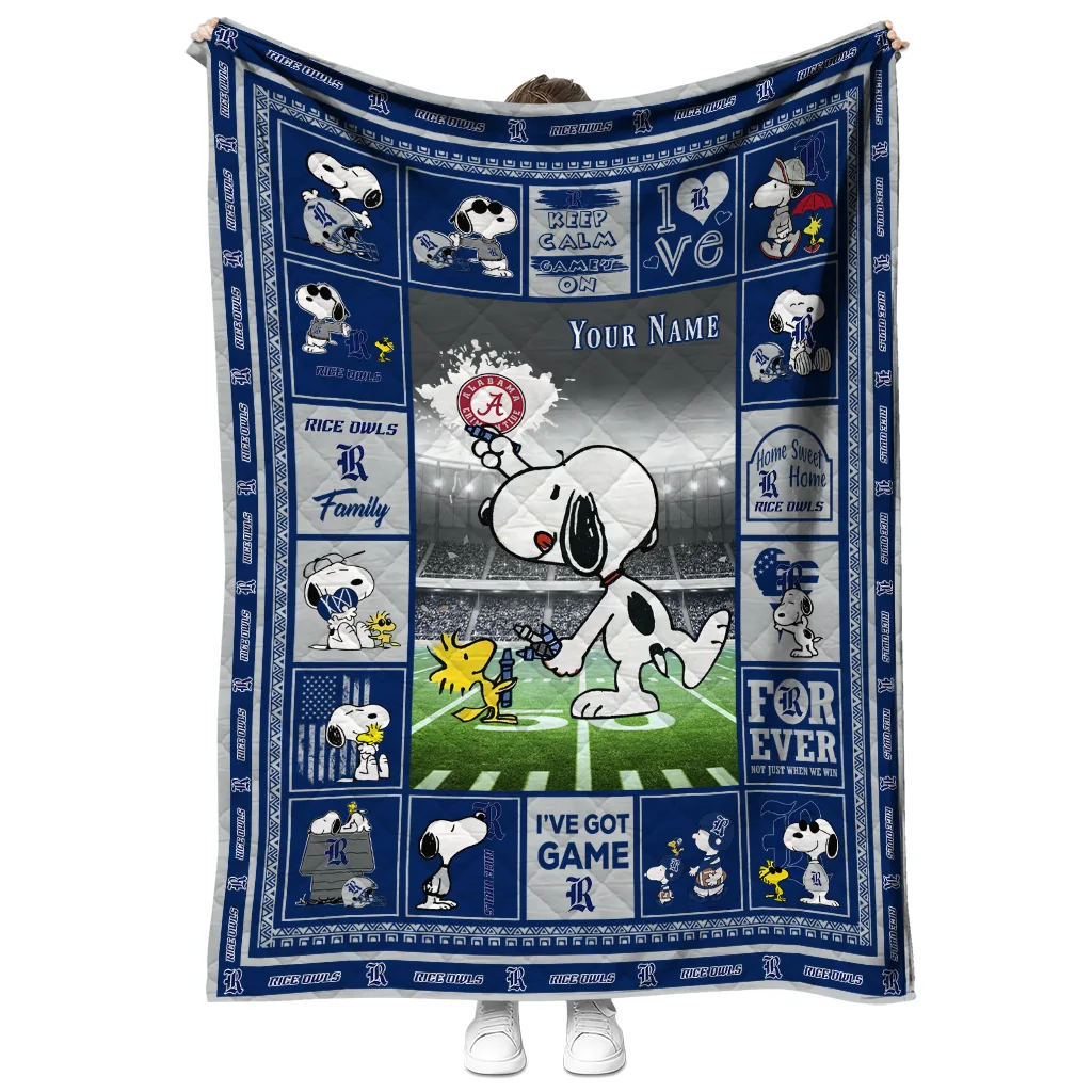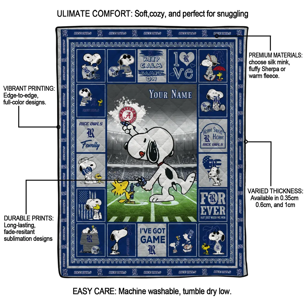 Wrap yourself in warmth and pride with the Personalized Rice Owls Snoopy Coach Navy Blue Quilt Blanket from the Rice Owls Blankets collection at Yes That Blanket. Made from 100% premium quilting-weight polyester blended with a touch of microfiber, this quilt offers a smooth, soft finish you’ll love. Choose between two quilting styles—Stipple or Diagonal—and enjoy the comfort of a cotton-filled layer inside that adds extra coziness for every season. The border is available in classic black or white, giving your design a clean, timeless edge.