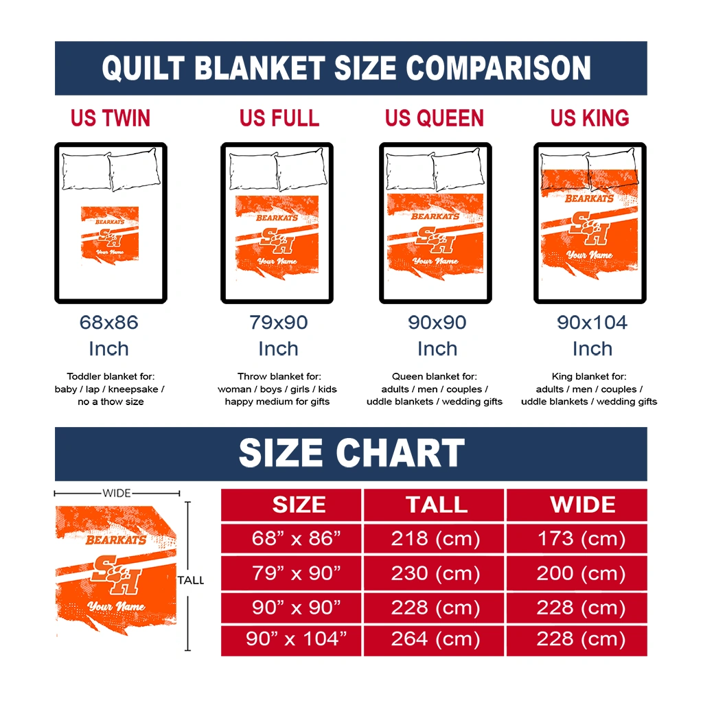 Wrap yourself in warmth and pride with the Personalized Sam Houston Bearkats Brushstroke Layers Orange Quilt Blanket from the Sam Houston Bearkats Blankets collection at Yes That Blanket. Made from 100% premium quilting-weight polyester blended with a touch of microfiber, this quilt offers a smooth, soft finish you’ll love. Choose between two quilting styles—Stipple or Diagonal—and enjoy the comfort of a cotton-filled layer inside that adds extra coziness for every season. The border is available in classic black or white, giving your design a clean, timeless edge.