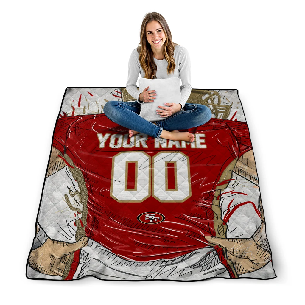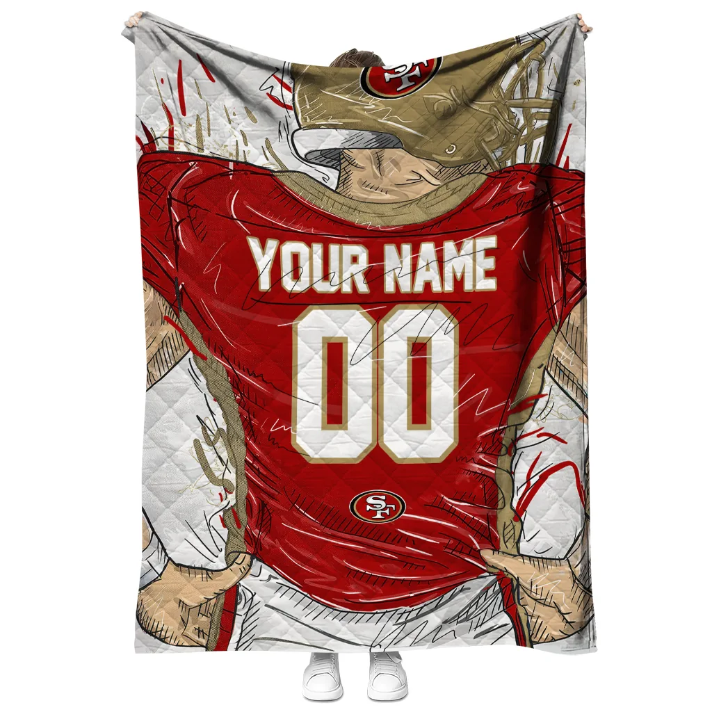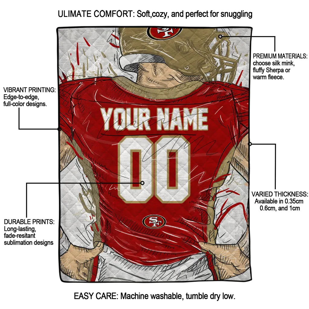 The Personalized San Francisco 49ers Player Sketch Red Gray Quilt Blanket is more than a blanket—it’s everyday comfort, thoughtfully made. Crafted from premium quilting fabric with a soft microfiber touch, it offers a smooth hand-feel and lasting coziness. Layered quilting with a cotton-filled core provides adaptable warmth across seasons while maintaining a clean, tailored look on your bed or sofa.