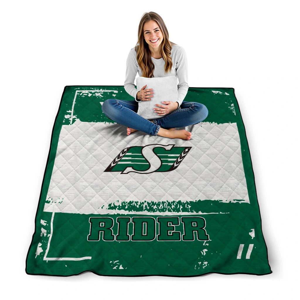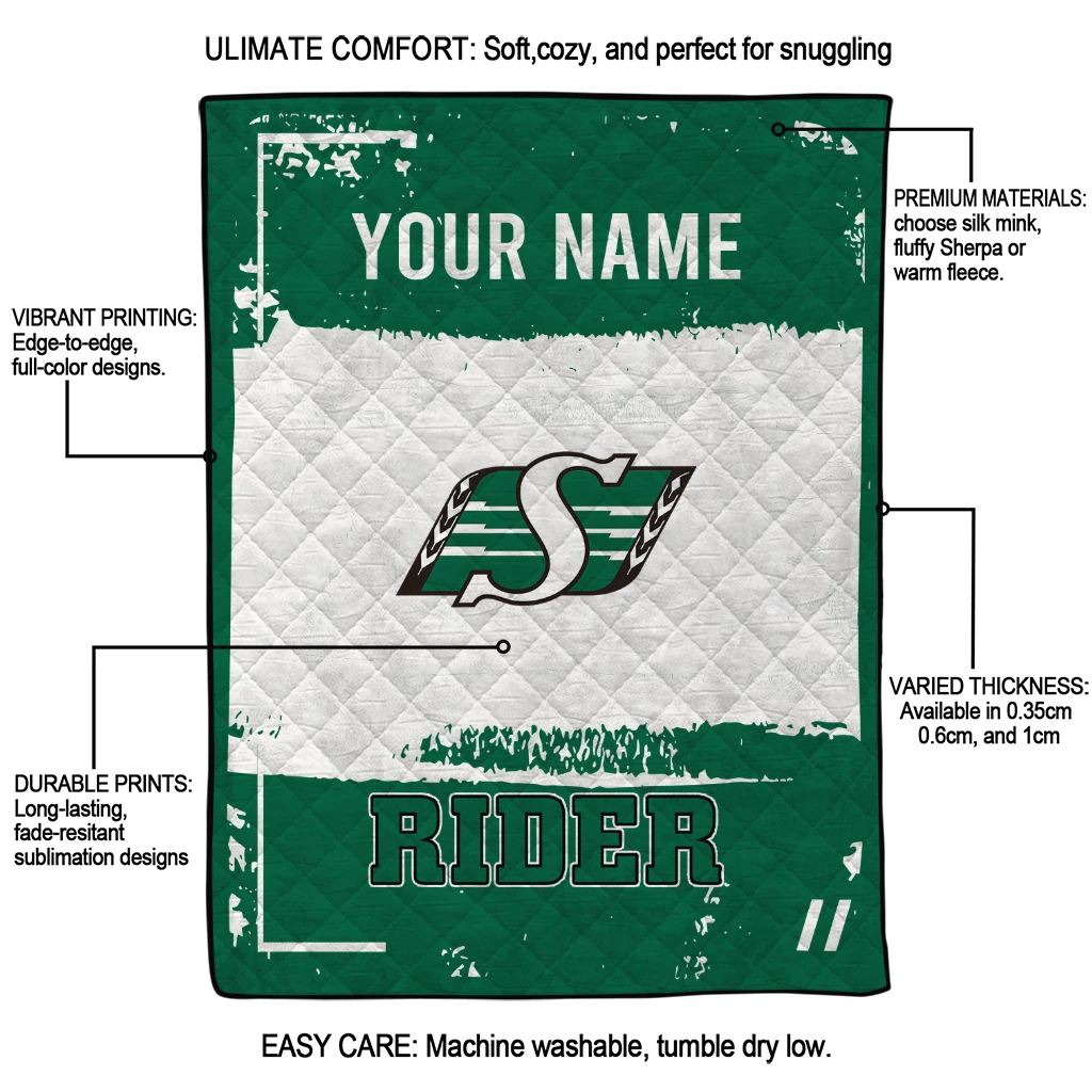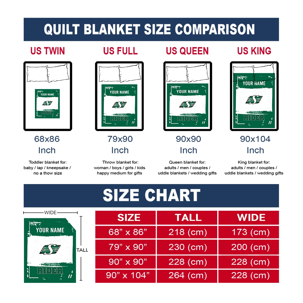 Wrap yourself in warmth and pride with the Personalized Saskatchewan Roughriders Grunge Patch Green White Quilt Blanket from the Saskatchewan Roughriders Blankets collection at Yes That Blanket. Made from 100% premium quilting-weight polyester blended with a touch of microfiber, this quilt offers a smooth, soft finish you’ll love. Choose between two quilting styles—Stipple or Diagonal—and enjoy the comfort of a cotton-filled layer inside that adds extra coziness for every season. The border is available in classic black or white, giving your design a clean, timeless edge.
