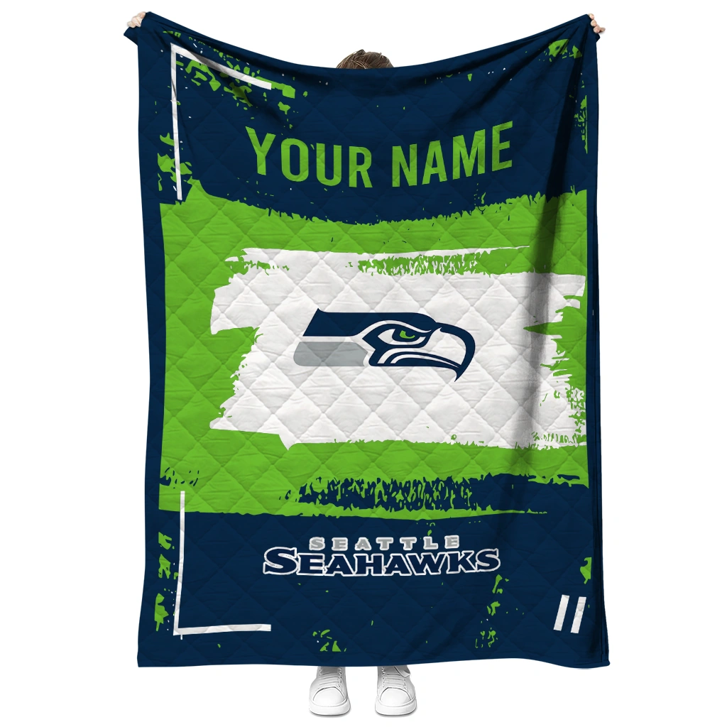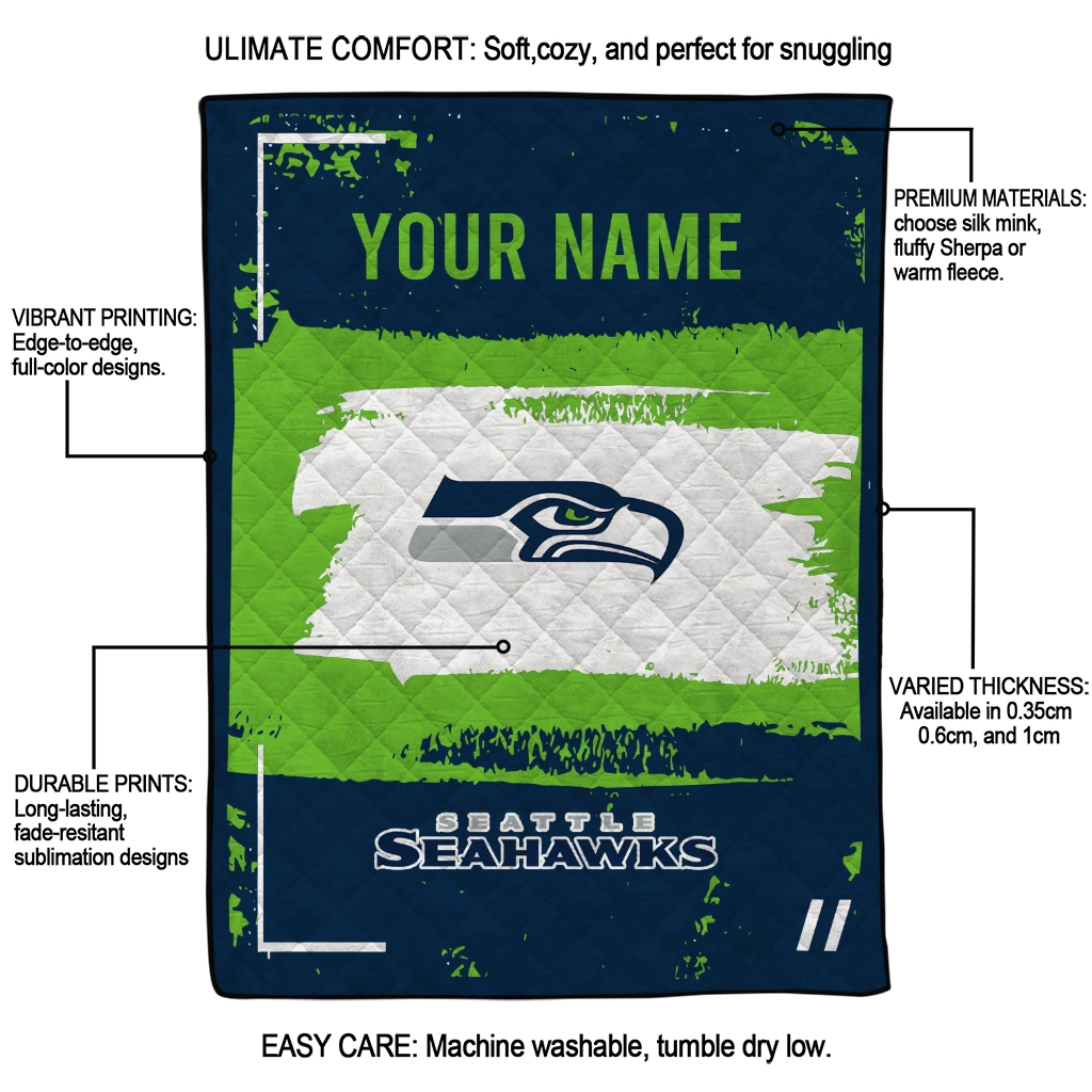 Wrap yourself in warmth and pride with the Personalized Seattle Seahawks Grunge Patch Blue White Quilt Blanket from the Seattle Seahawks Blankets collection at Yes That Blanket. Made from 100% premium quilting-weight polyester blended with a touch of microfiber, this quilt offers a smooth, soft finish you’ll love. Choose between two quilting styles—Stipple or Diagonal—and enjoy the comfort of a cotton-filled layer inside that adds extra coziness for every season. The border is available in classic black or white, giving your design a clean, timeless edge.