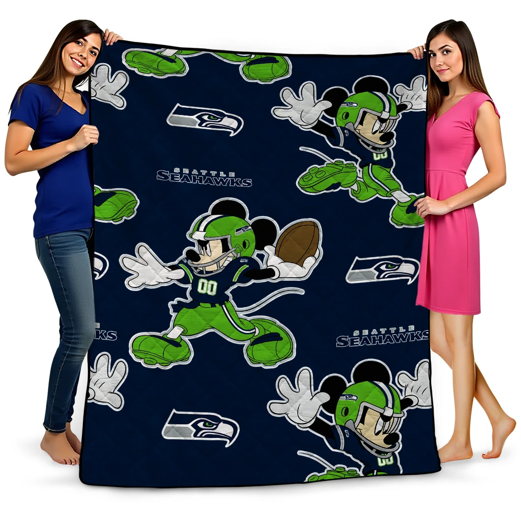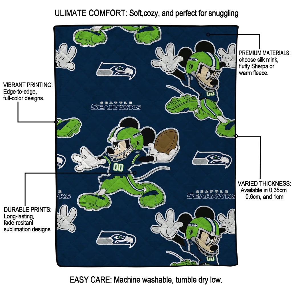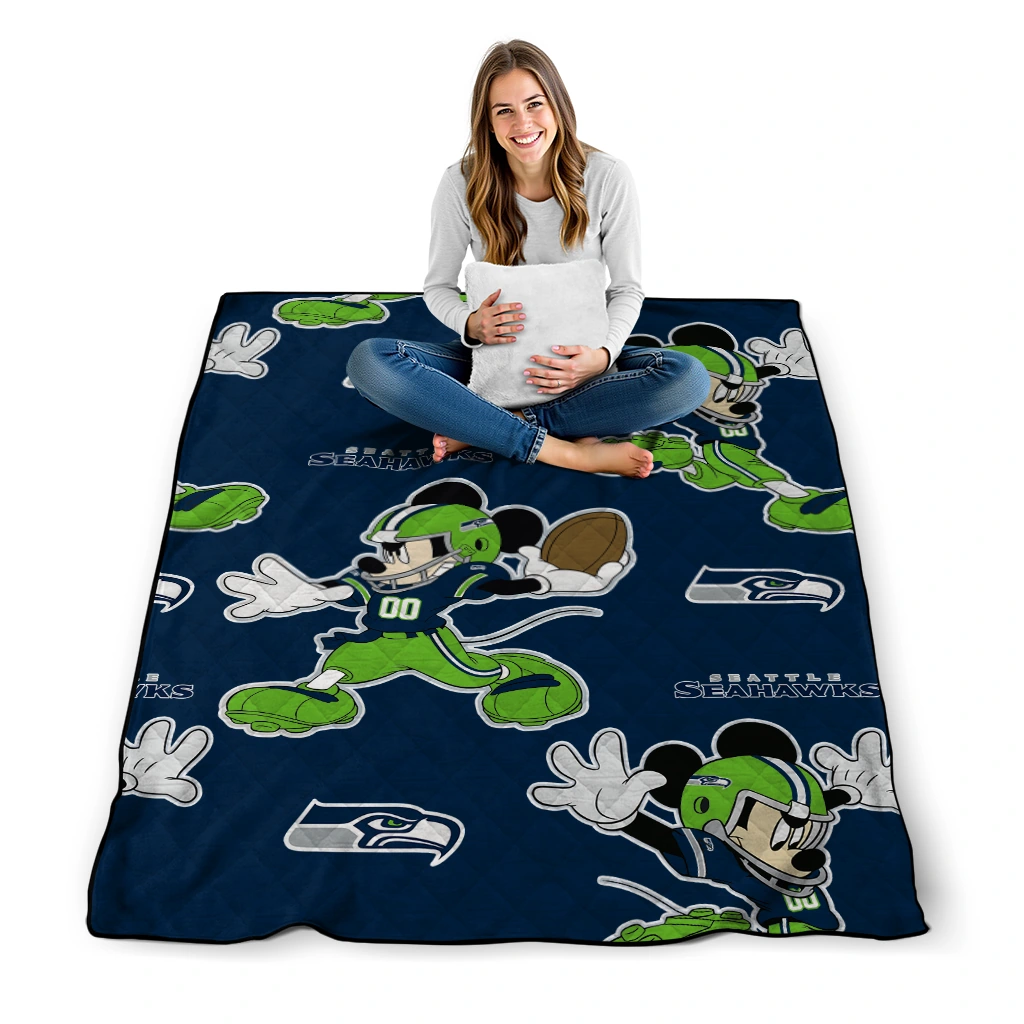 The Personalized Seattle Seahawks Mickey Football Blue Quilt Blanket is more than a blanket—it’s everyday comfort, thoughtfully made. Crafted from premium quilting fabric with a soft microfiber touch, it offers a smooth hand-feel and lasting coziness. Layered quilting with a cotton-filled core provides adaptable warmth across seasons while maintaining a clean, tailored look on your bed or sofa.