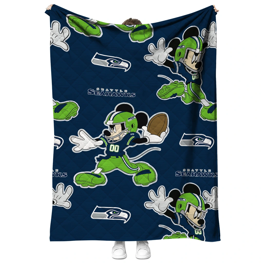 Wrap yourself in warmth and pride with the Personalized Seattle Seahawks Mickey Football Blue Quilt Blanket from the Seattle Seahawks Blankets collection at Yes That Blanket. Made from 100% premium quilting-weight polyester blended with a touch of microfiber, this quilt offers a smooth, soft finish you’ll love. Choose between two quilting styles—Stipple or Diagonal—and enjoy the comfort of a cotton-filled layer inside that adds extra coziness for every season. The border is available in classic black or white, giving your design a clean, timeless edge.