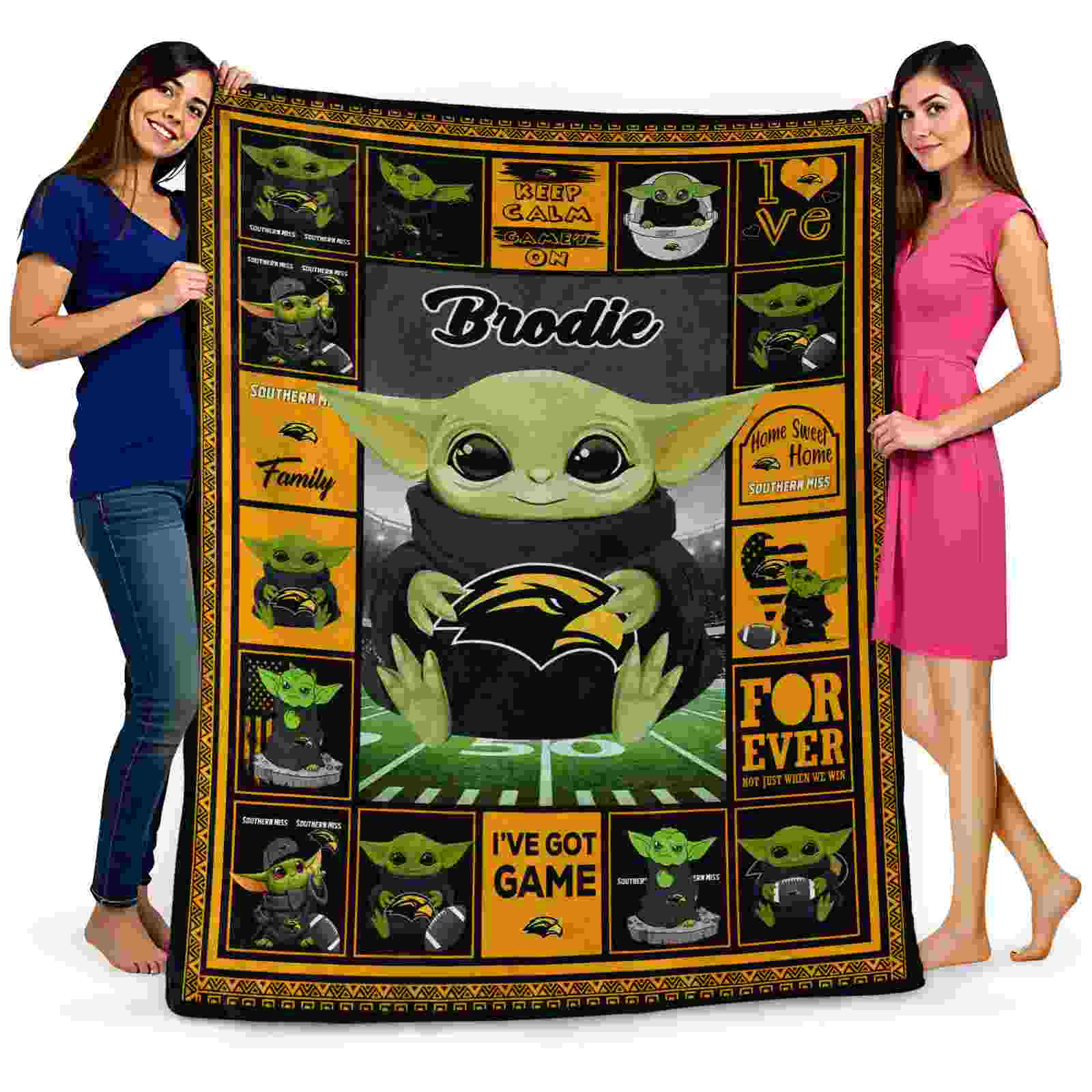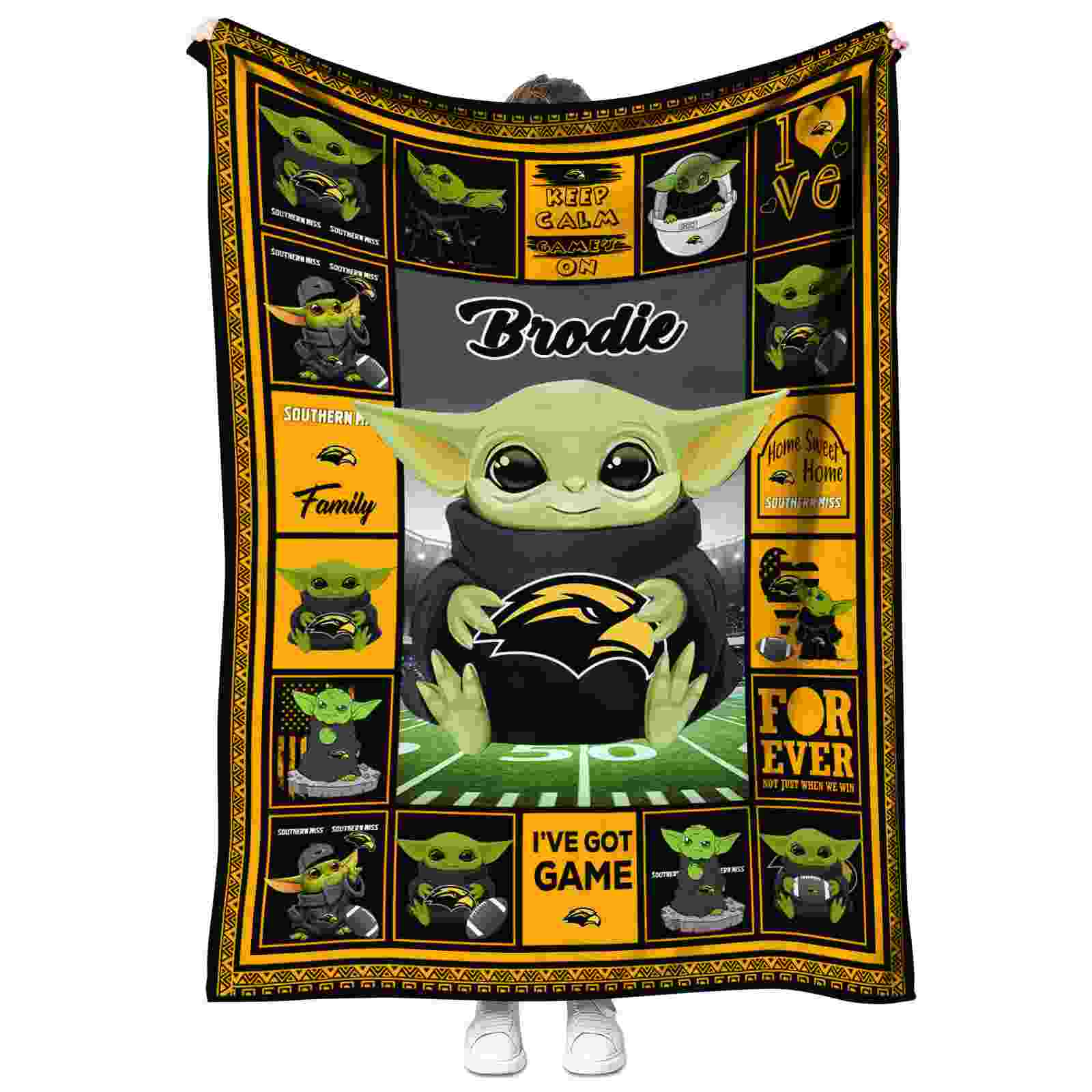 Without a doubt, the Personalized Southern Miss Golden Eagles Baby Yoda Black Blanket from Southern Miss Golden Eagles Blankets collection is offering true fans a chance to showcase passion in a cool way. Personalize it with your favorite team's logo or a meaningful name to make it uniquely yours. Isn't that great? The full-color print ensures vibrant, edge-to-edge designs, bringing your sports enthusiasm to life!