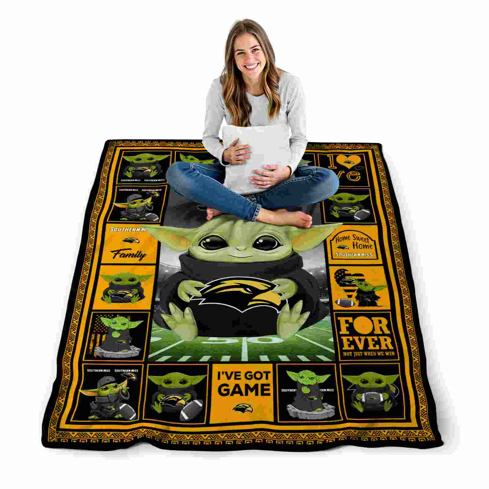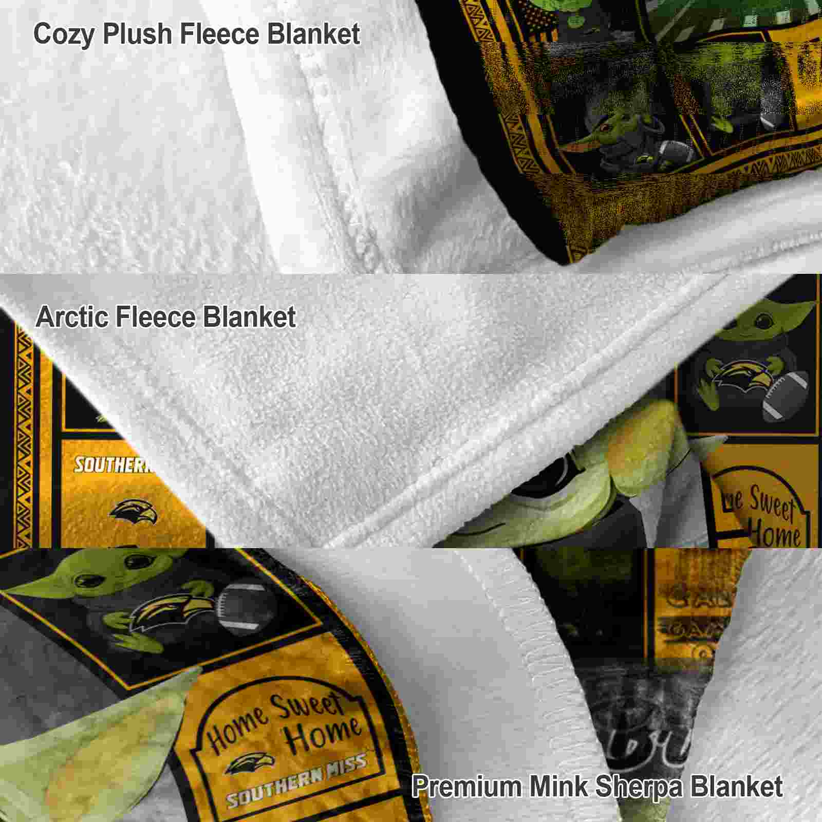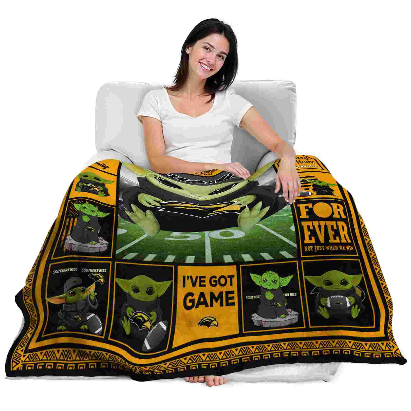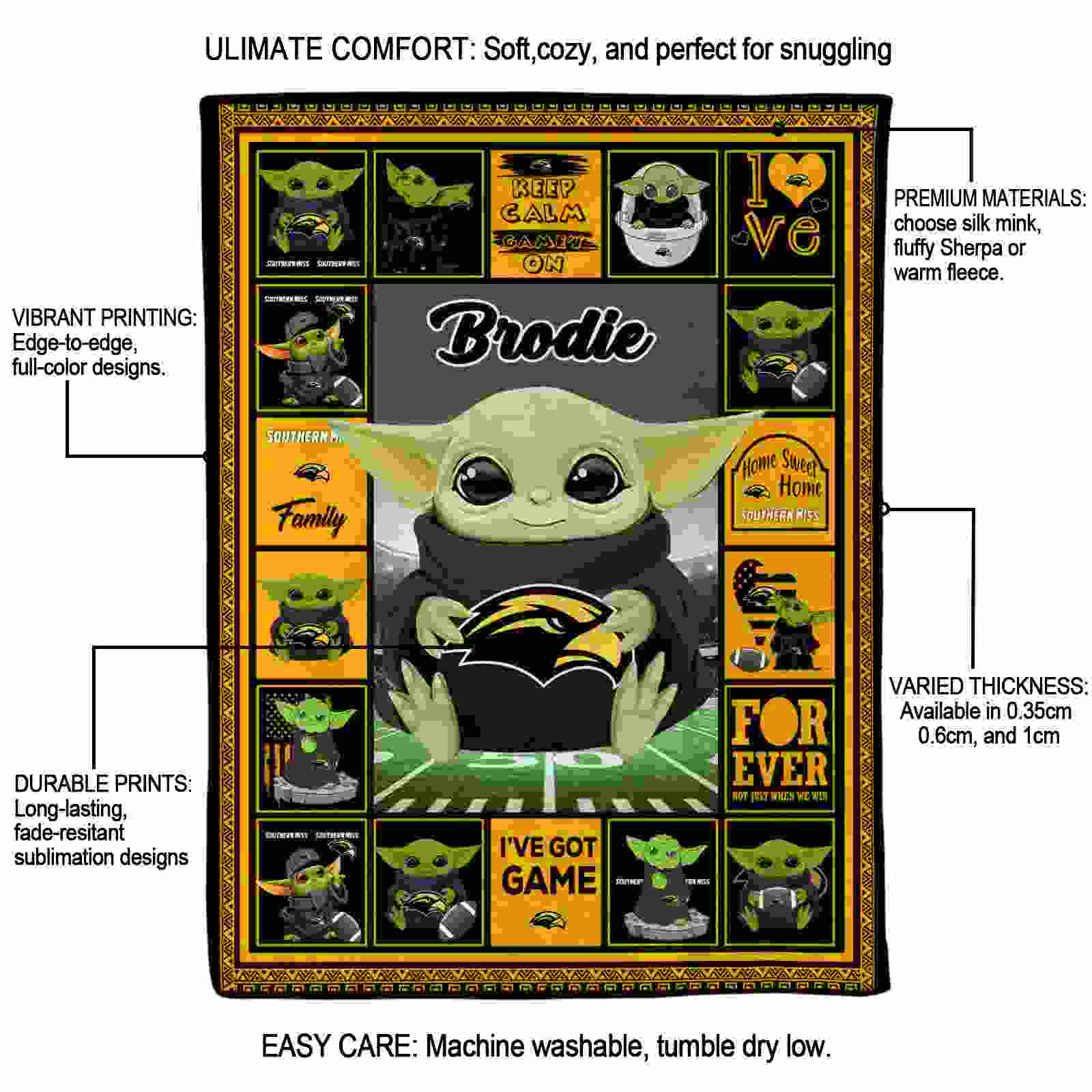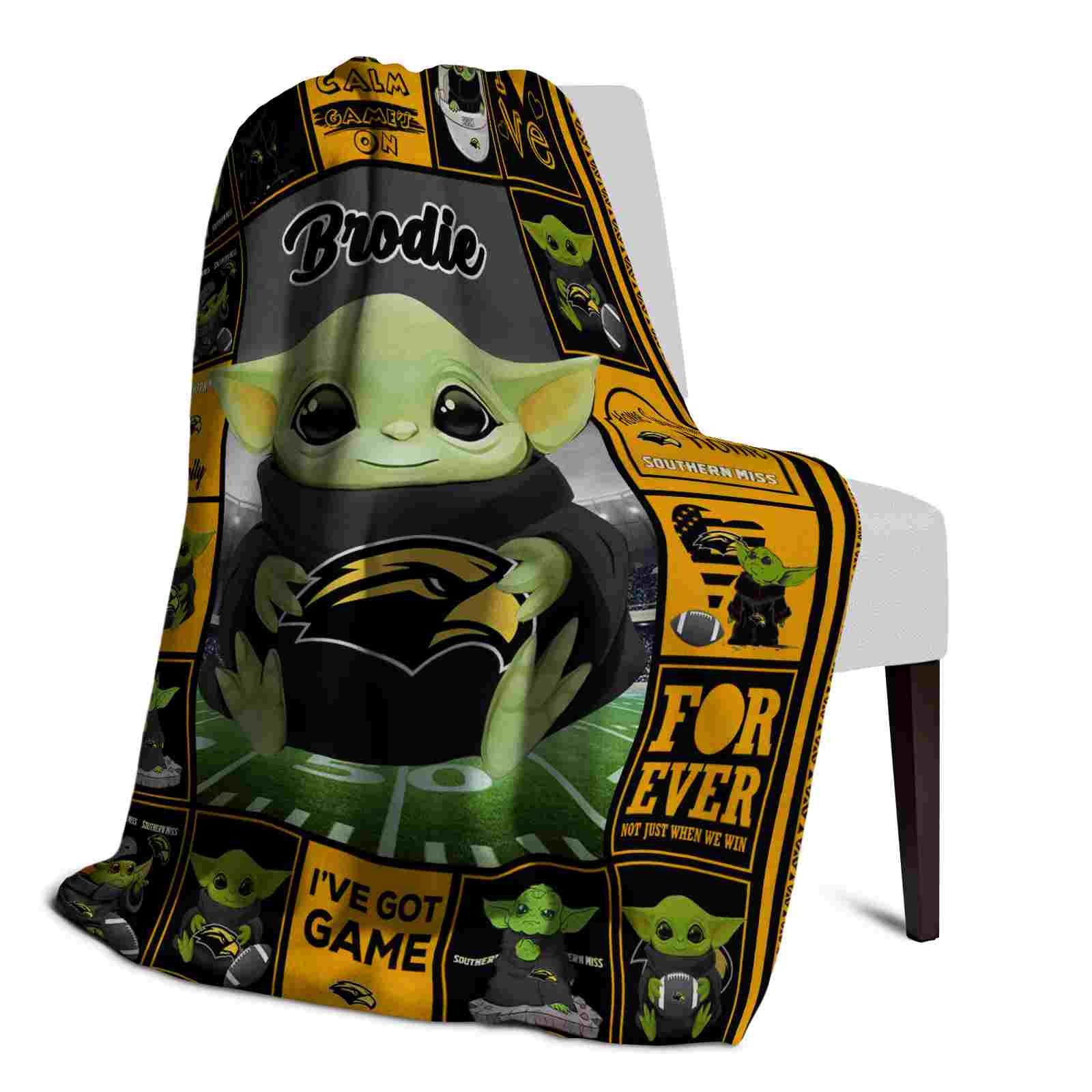The Personalized Southern Miss Golden Eagles Baby Yoda Black Blanket isn't just a blanket—it's your connection to the game. Snuggle up while reliving legendary plays or dreaming of future championships. Its bold, team-inspired designs keep your love for the sport front and center, while its easy-care durability means it's always ready for your next adventure. From cheering at home to showcasing your loyalty on the go, this item of NCAA Blankets collection is made for fans who live and breathe the game.