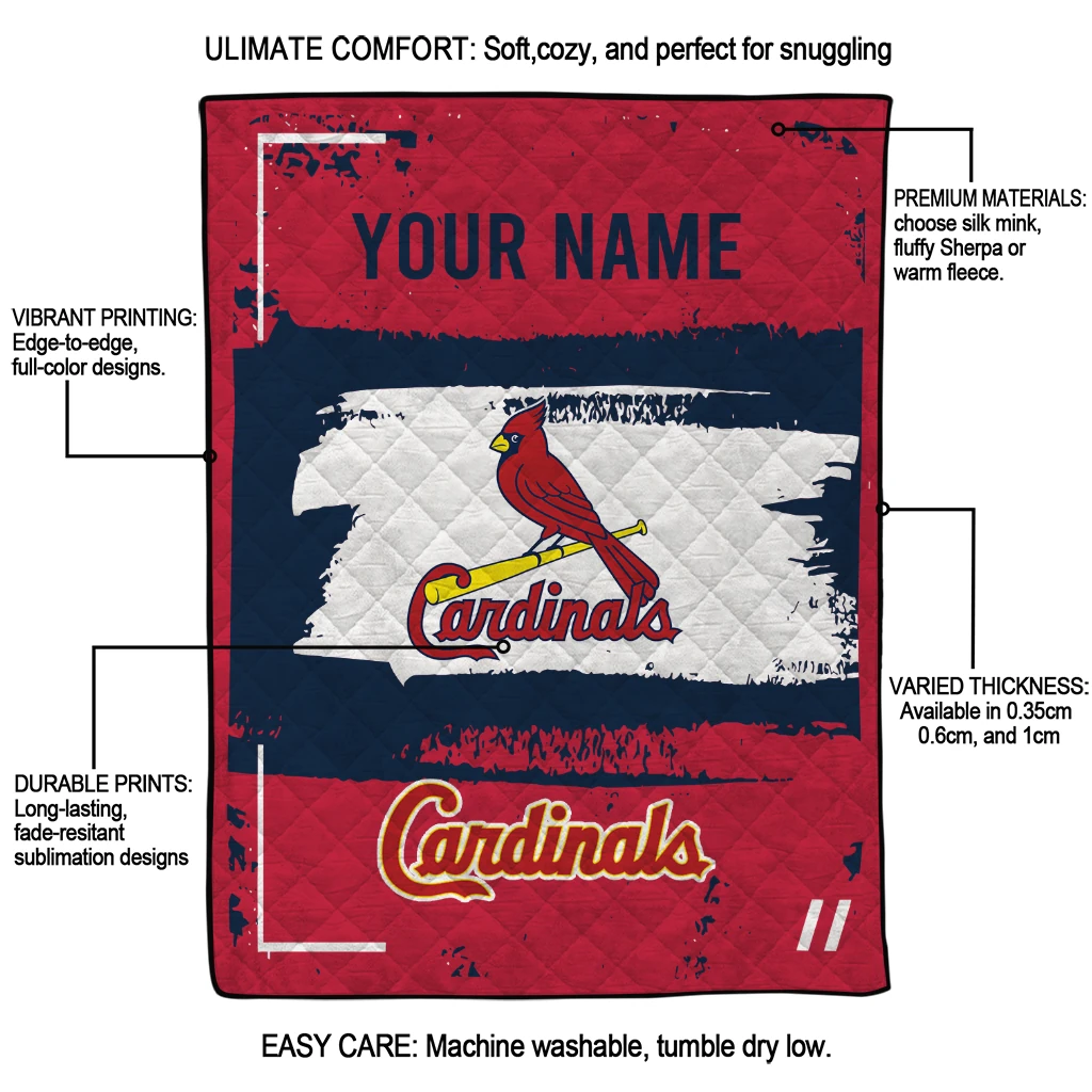 Wrap yourself in warmth and pride with the Personalized St. Louis Cardinals Grunge Patch Red White Quilt Blanket from the St. Louis Cardinals Blankets collection at Yes That Blanket. Made from 100% premium quilting-weight polyester blended with a touch of microfiber, this quilt offers a smooth, soft finish you’ll love. Choose between two quilting styles—Stipple or Diagonal—and enjoy the comfort of a cotton-filled layer inside that adds extra coziness for every season. The border is available in classic black or white, giving your design a clean, timeless edge.