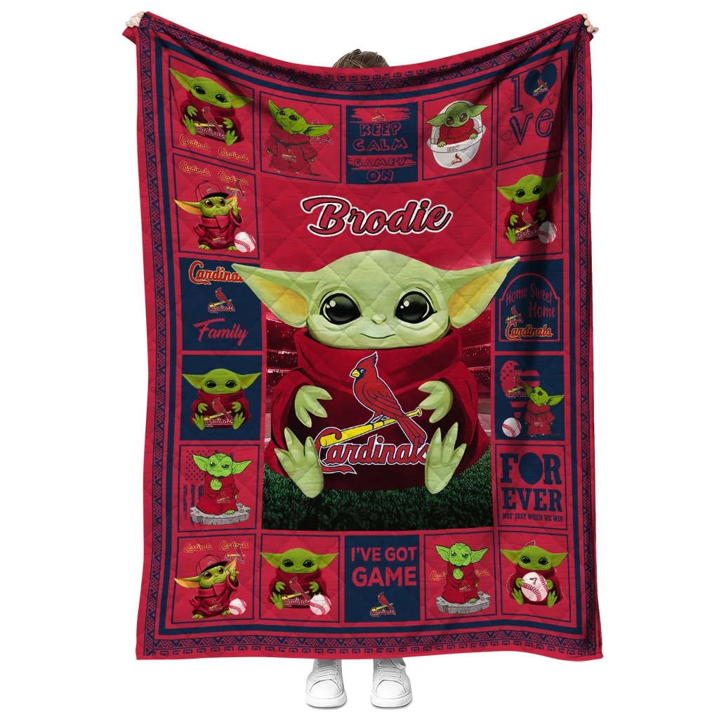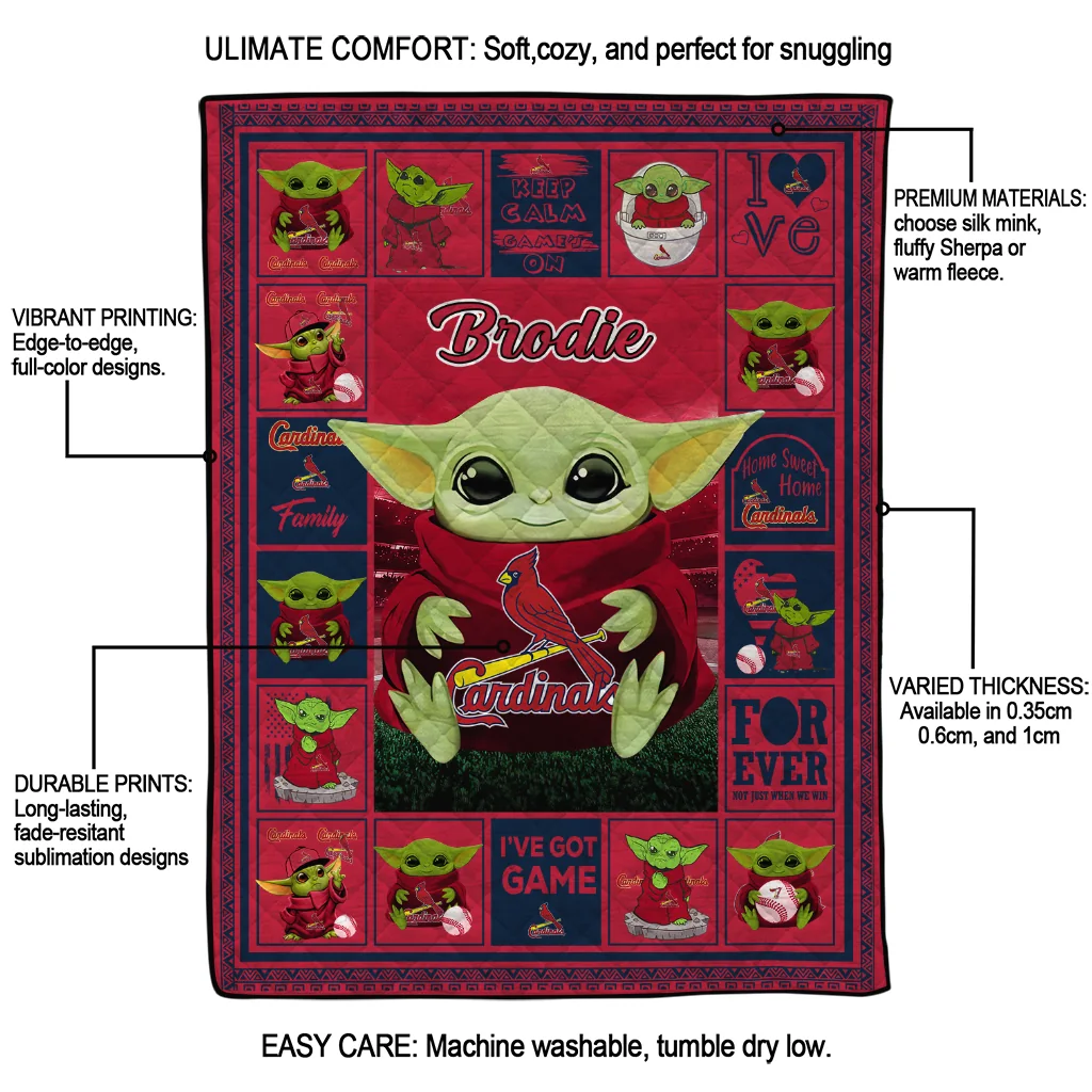 Wrap yourself in warmth and pride with the Personalized St. Louis Cardinals Yody Baby Motif Red Quilt Blanket from the St. Louis Cardinals Blankets collection at Yes That Blanket. Made from 100% premium quilting-weight polyester blended with a touch of microfiber, this quilt offers a smooth, soft finish you’ll love. Choose between two quilting styles—Stipple or Diagonal—and enjoy the comfort of a cotton-filled layer inside that adds extra coziness for every season. The border is available in classic black or white, giving your design a clean, timeless edge.