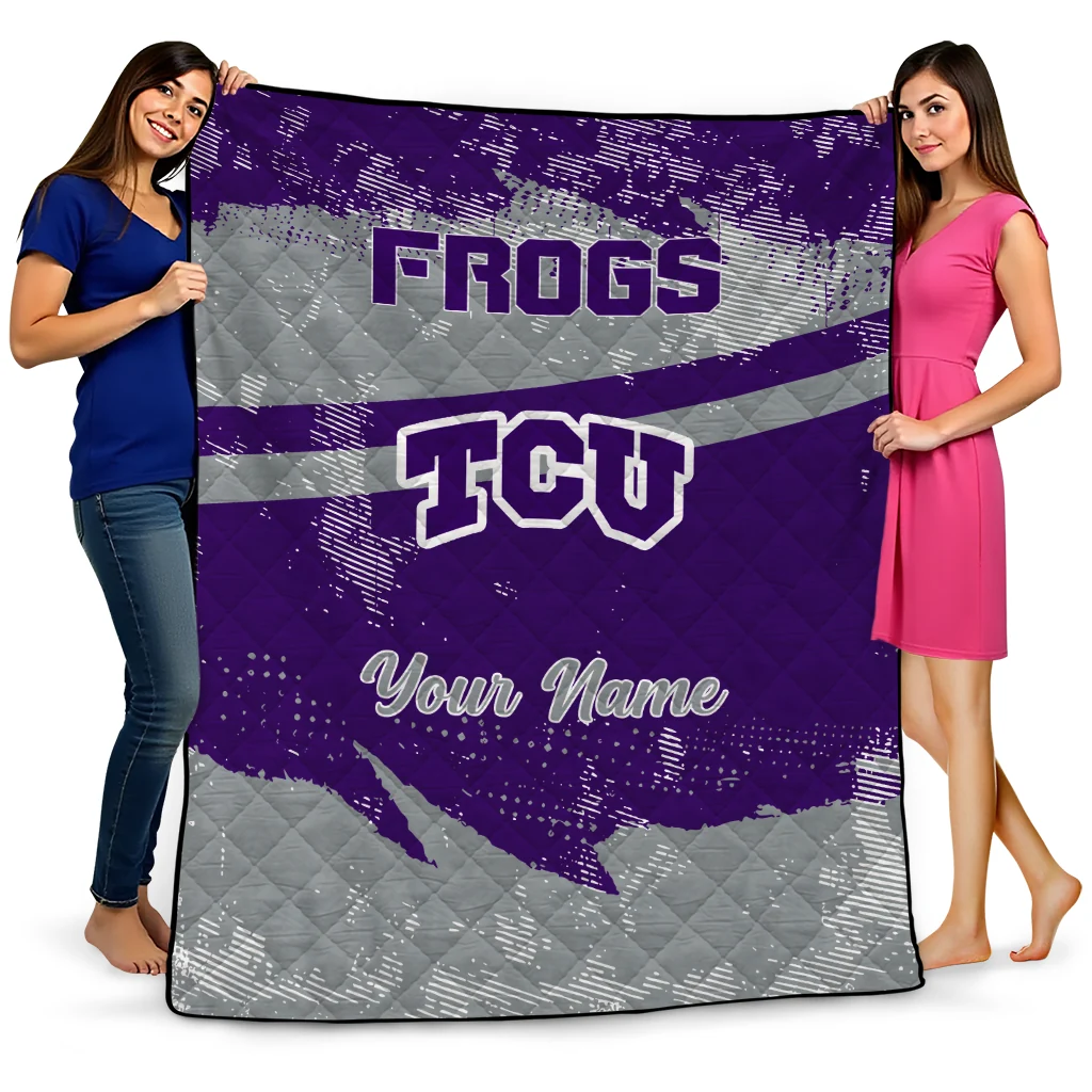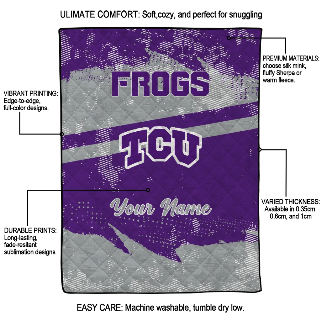 Wrap yourself in warmth and pride with the Personalized TCU Horned Frogs Brushstroke Layers Purple Quilt Blanket from the TCU Horned Frogs Blankets collection at Yes That Blanket. Made from 100% premium quilting-weight polyester blended with a touch of microfiber, this quilt offers a smooth, soft finish you’ll love. Choose between two quilting styles—Stipple or Diagonal—and enjoy the comfort of a cotton-filled layer inside that adds extra coziness for every season. The border is available in classic black or white, giving your design a clean, timeless edge.