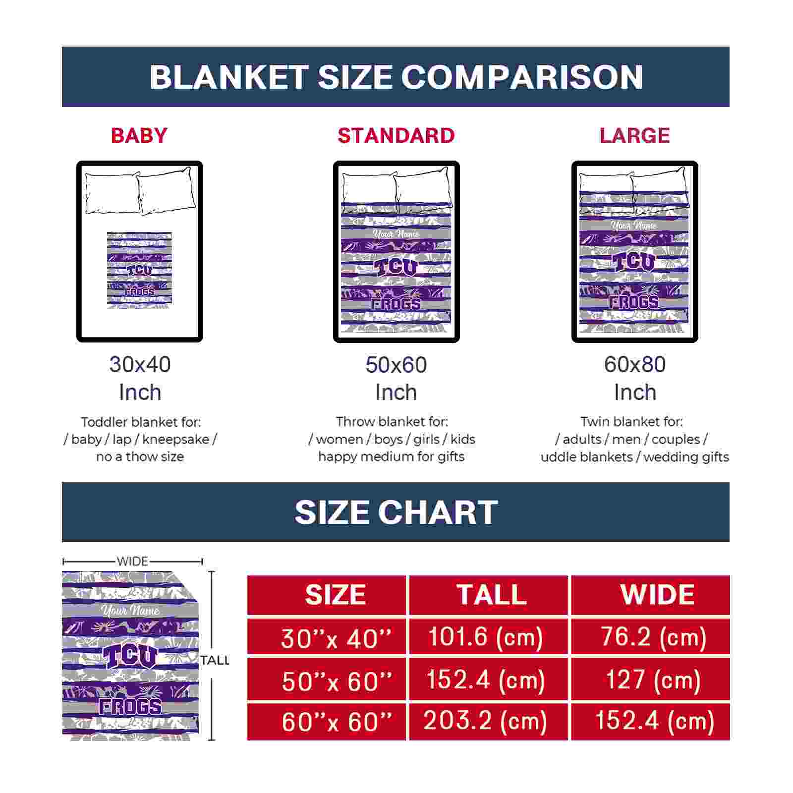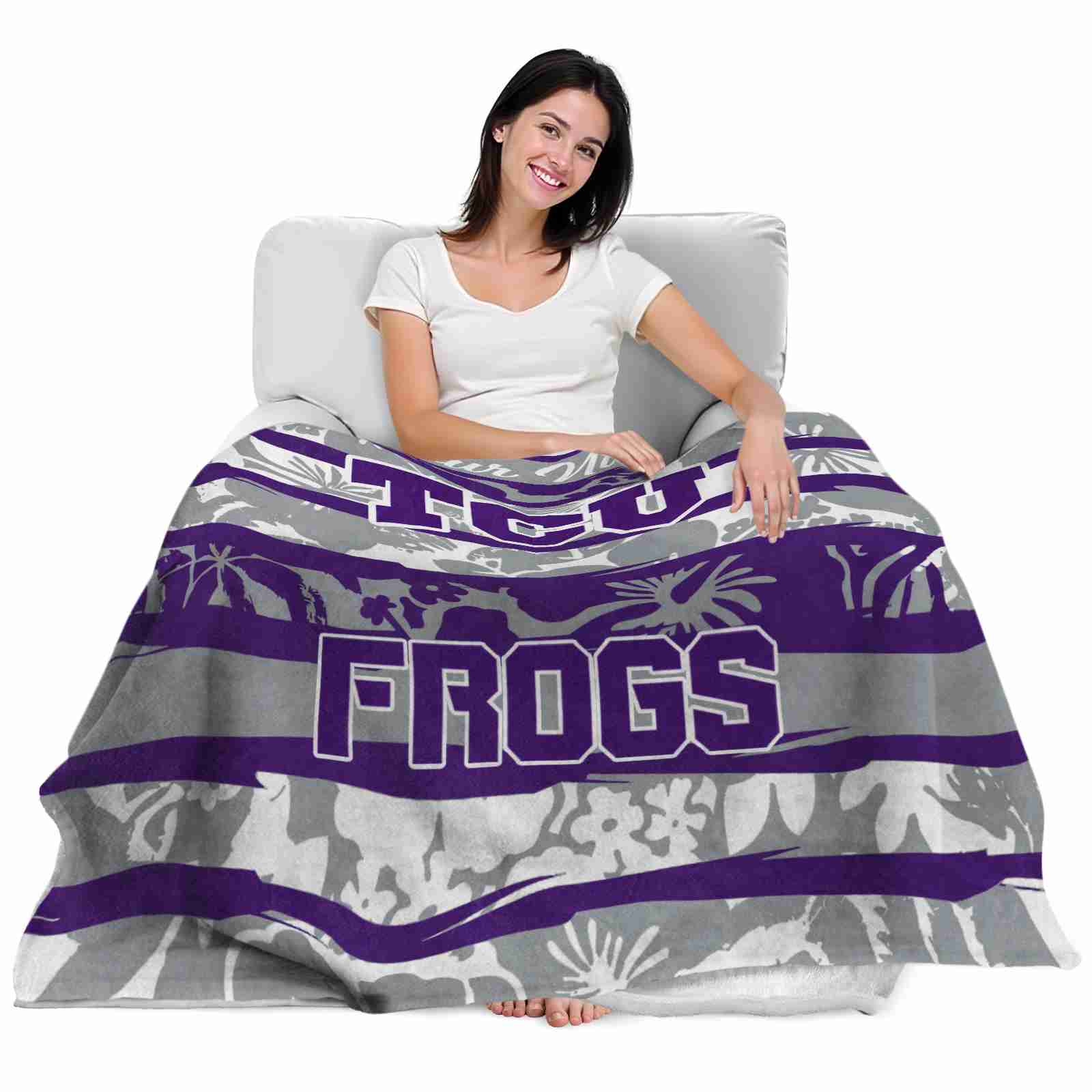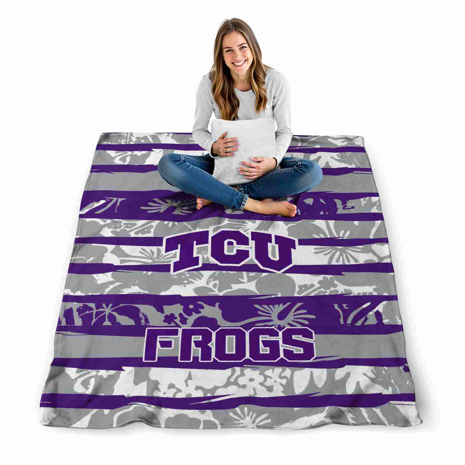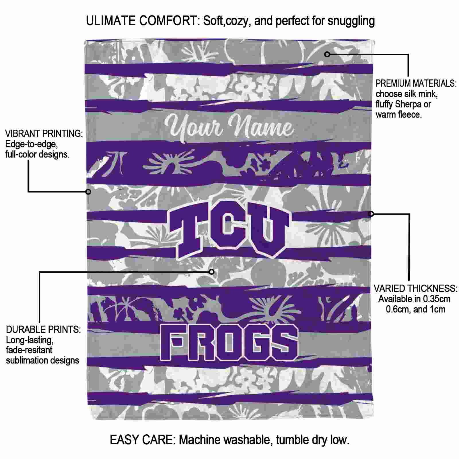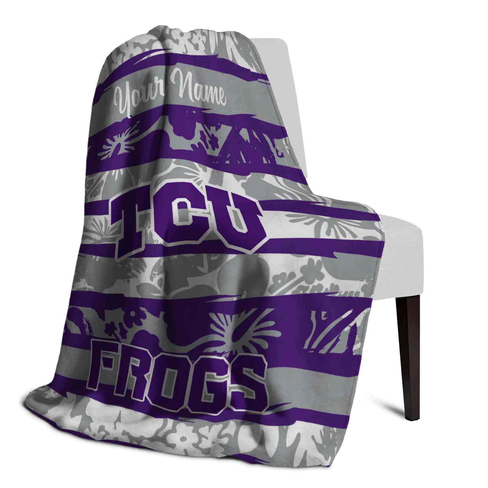 Without a doubt, the Personalized TCU Horned Frogs Floral Stripes Purple White Blanket from TCU Horned Frogs Blankets collection is offering true fans a chance to showcase passion in a cool way. Personalize it with your favorite team’s logo or a meaningful name to make it uniquely yours. Isn’t that great? The full-color print ensures vibrant, edge-to-edge designs, bringing your sports enthusiasm to life!
