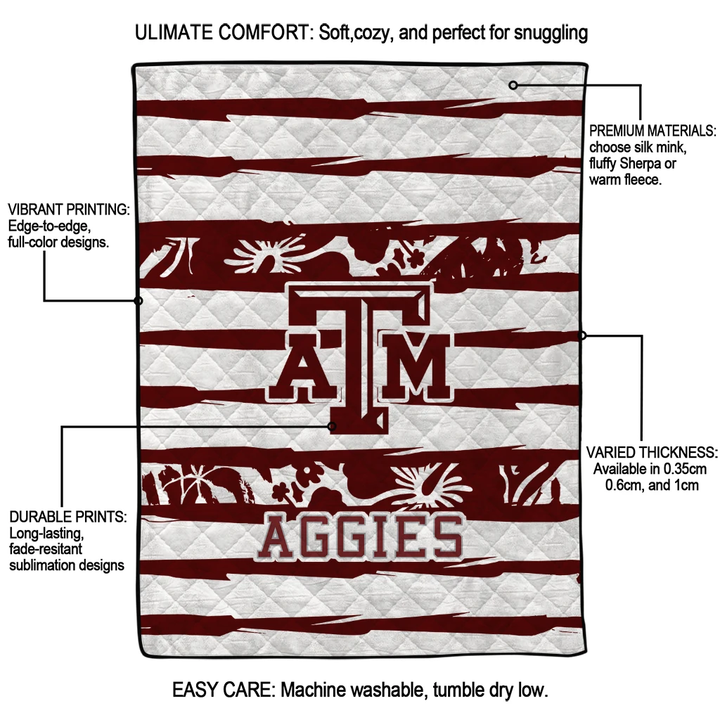 Wrap yourself in warmth and pride with the Personalized Texas A&M Aggies Layered Florals Maroon White Quilt Blanket from the Texas A&M Aggies Blankets collection at Yes That Blanket. Made from 100% premium quilting-weight polyester blended with a touch of microfiber, this quilt offers a smooth, soft finish you’ll love. Choose between two quilting styles—Stipple or Diagonal—and enjoy the comfort of a cotton-filled layer inside that adds extra coziness for every season. The border is available in classic black or white, giving your design a clean, timeless edge.