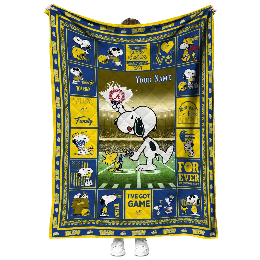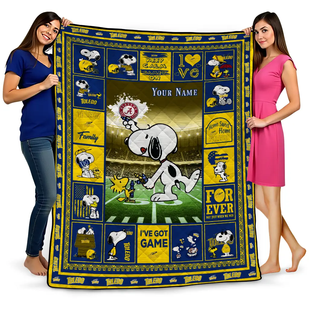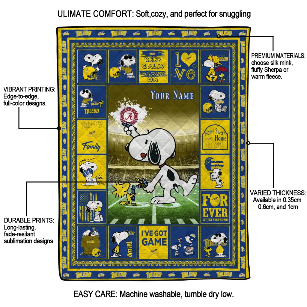 Wrap yourself in warmth and pride with the Personalized Toledo Rockets Snoopy Coach Blue Quilt Blanket from the Toledo Rockets Blankets collection at Yes That Blanket. Made from 100% premium quilting-weight polyester blended with a touch of microfiber, this quilt offers a smooth, soft finish you’ll love. Choose between two quilting styles—Stipple or Diagonal—and enjoy the comfort of a cotton-filled layer inside that adds extra coziness for every season. The border is available in classic black or white, giving your design a clean, timeless edge.