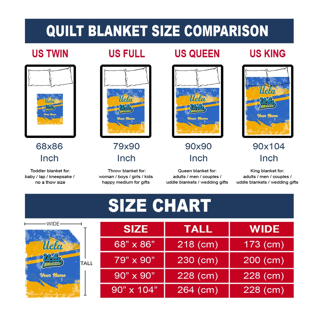 Wrap yourself in warmth and pride with the Personalized UCLA Bruins Brushstroke Layers Blue Quilt Blanket from the UCLA Bruins Blankets collection at Yes That Blanket. Made from 100% premium quilting-weight polyester blended with a touch of microfiber, this quilt offers a smooth, soft finish you’ll love. Choose between two quilting styles—Stipple or Diagonal—and enjoy the comfort of a cotton-filled layer inside that adds extra coziness for every season. The border is available in classic black or white, giving your design a clean, timeless edge.