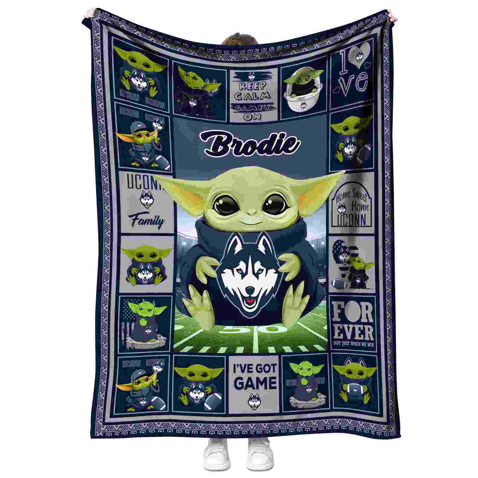 Personalized UConn Huskies Baby Yoda Blue Blanket