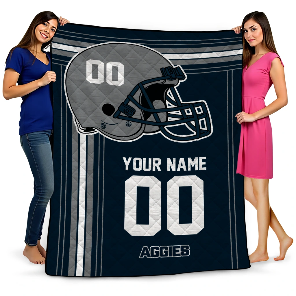 Wrap yourself in warmth and pride with the Personalized Utah State Aggies Helmet Theme Navy Quilt Blanket from the Utah State Aggies Blankets collection at Yes That Blanket. Made from 100% premium quilting-weight polyester blended with a touch of microfiber, this quilt offers a smooth, soft finish you’ll love. Choose between two quilting styles—Stipple or Diagonal—and enjoy the comfort of a cotton-filled layer inside that adds extra coziness for every season. The border is available in classic black or white, giving your design a clean, timeless edge.