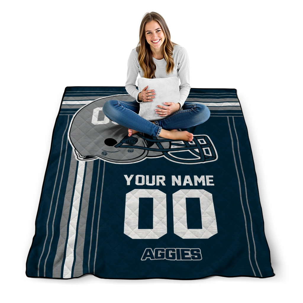 The Personalized Utah State Aggies Helmet Theme Navy Quilt Blanket is more than a blanket—it’s everyday comfort, thoughtfully made. Crafted from premium quilting fabric with a soft microfiber touch, it offers a smooth hand-feel and lasting coziness. Layered quilting with a cotton-filled core provides adaptable warmth across seasons while maintaining a clean, tailored look on your bed or sofa.