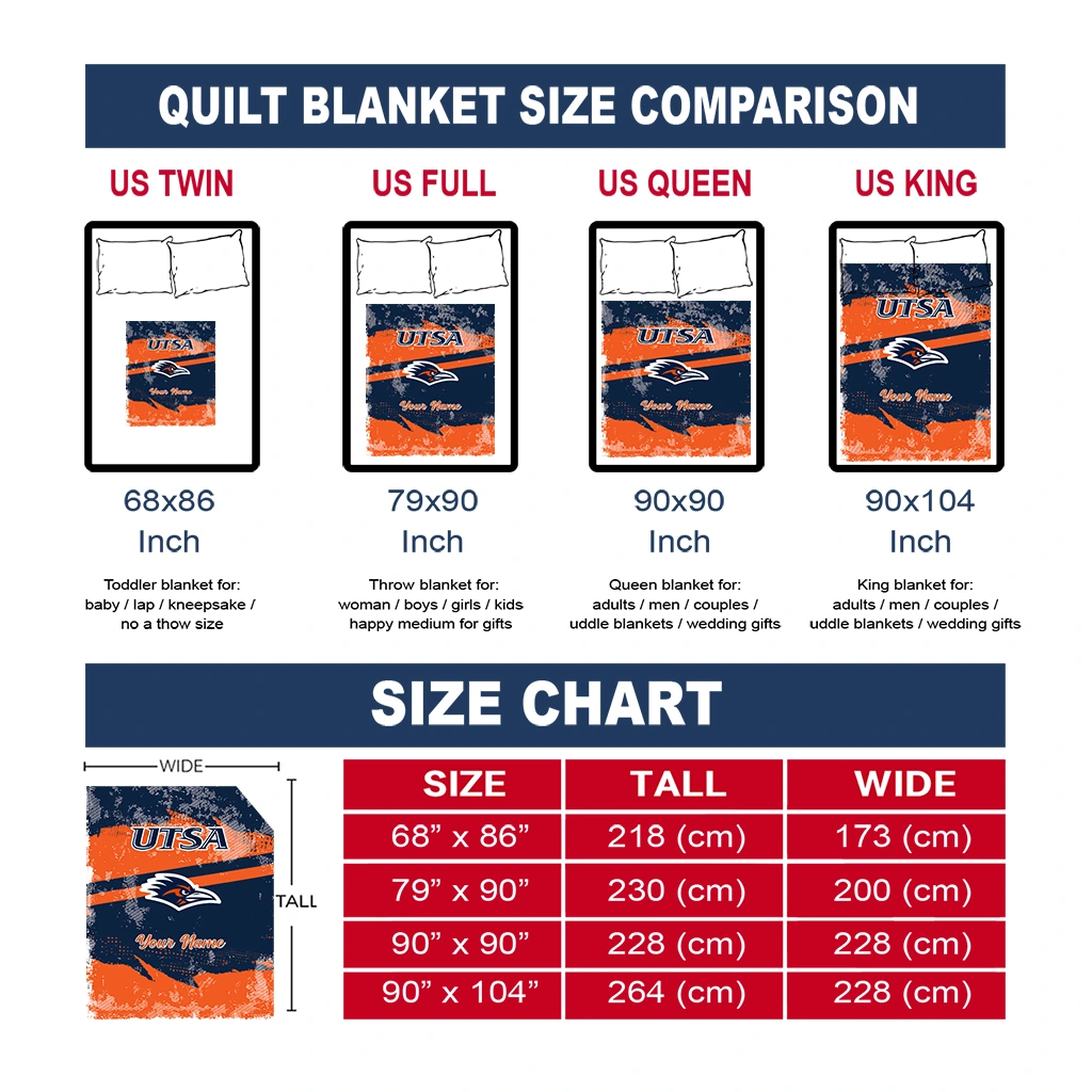 Wrap yourself in warmth and pride with the Personalized UTSA Roadrunners Brushstroke Layers Orange Quilt Blanket from the UTSA Roadrunners Blankets collection at Yes That Blanket. Made from 100% premium quilting-weight polyester blended with a touch of microfiber, this quilt offers a smooth, soft finish you’ll love. Choose between two quilting styles—Stipple or Diagonal—and enjoy the comfort of a cotton-filled layer inside that adds extra coziness for every season. The border is available in classic black or white, giving your design a clean, timeless edge.