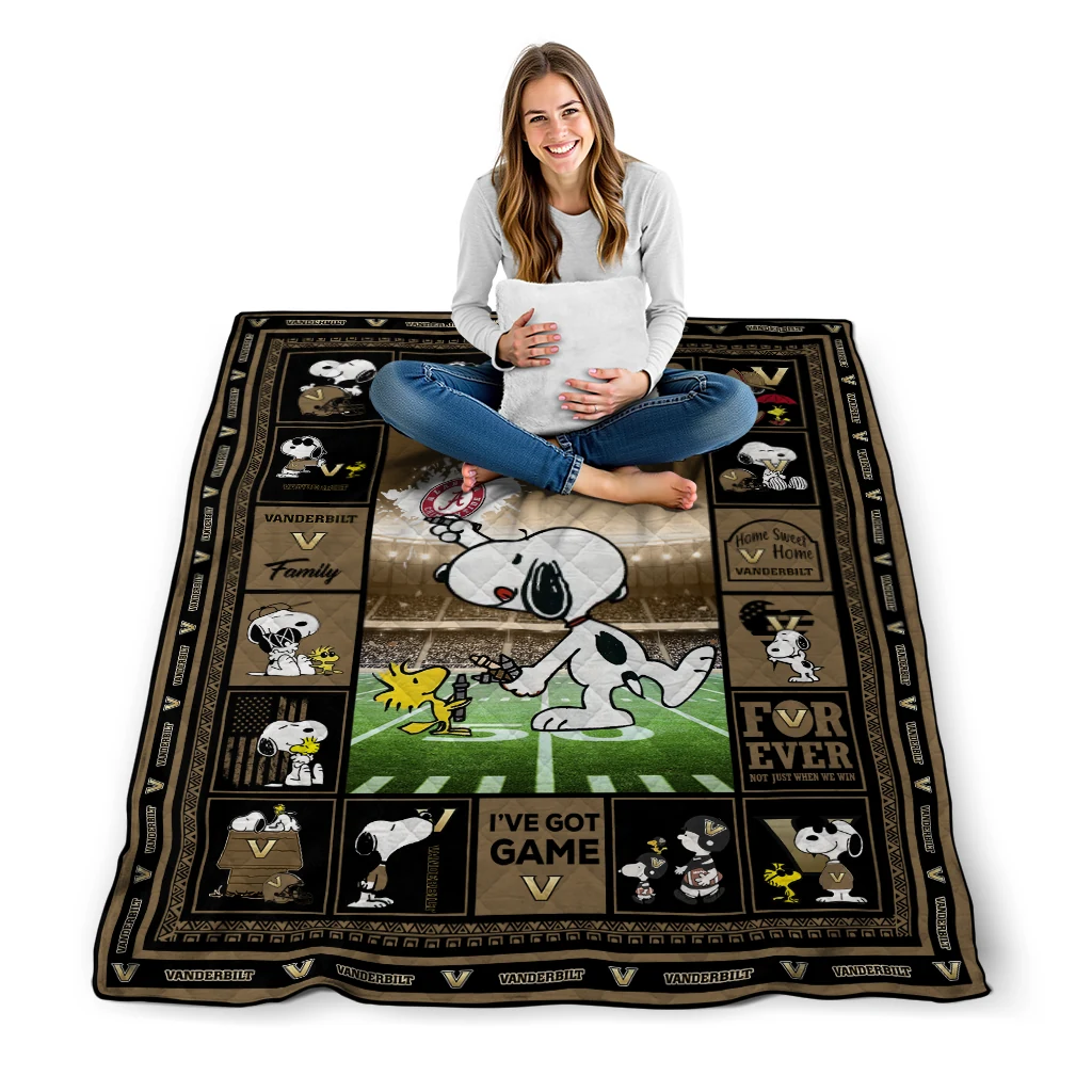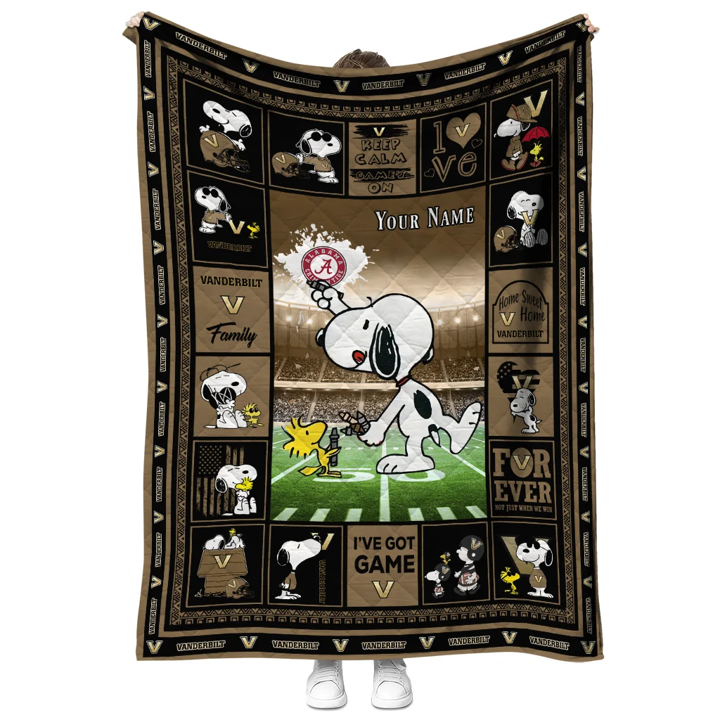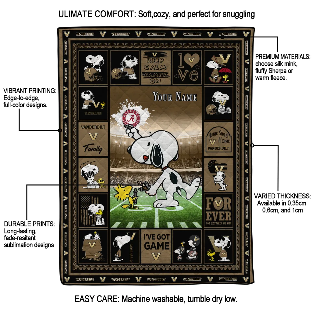 Wrap yourself in warmth and pride with the Personalized Vanderbilt Commodores Snoopy Coach Black Quilt Blanket from the Vanderbilt Commodores Blankets collection at Yes That Blanket. Made from 100% premium quilting-weight polyester blended with a touch of microfiber, this quilt offers a smooth, soft finish you’ll love. Choose between two quilting styles—Stipple or Diagonal—and enjoy the comfort of a cotton-filled layer inside that adds extra coziness for every season. The border is available in classic black or white, giving your design a clean, timeless edge.