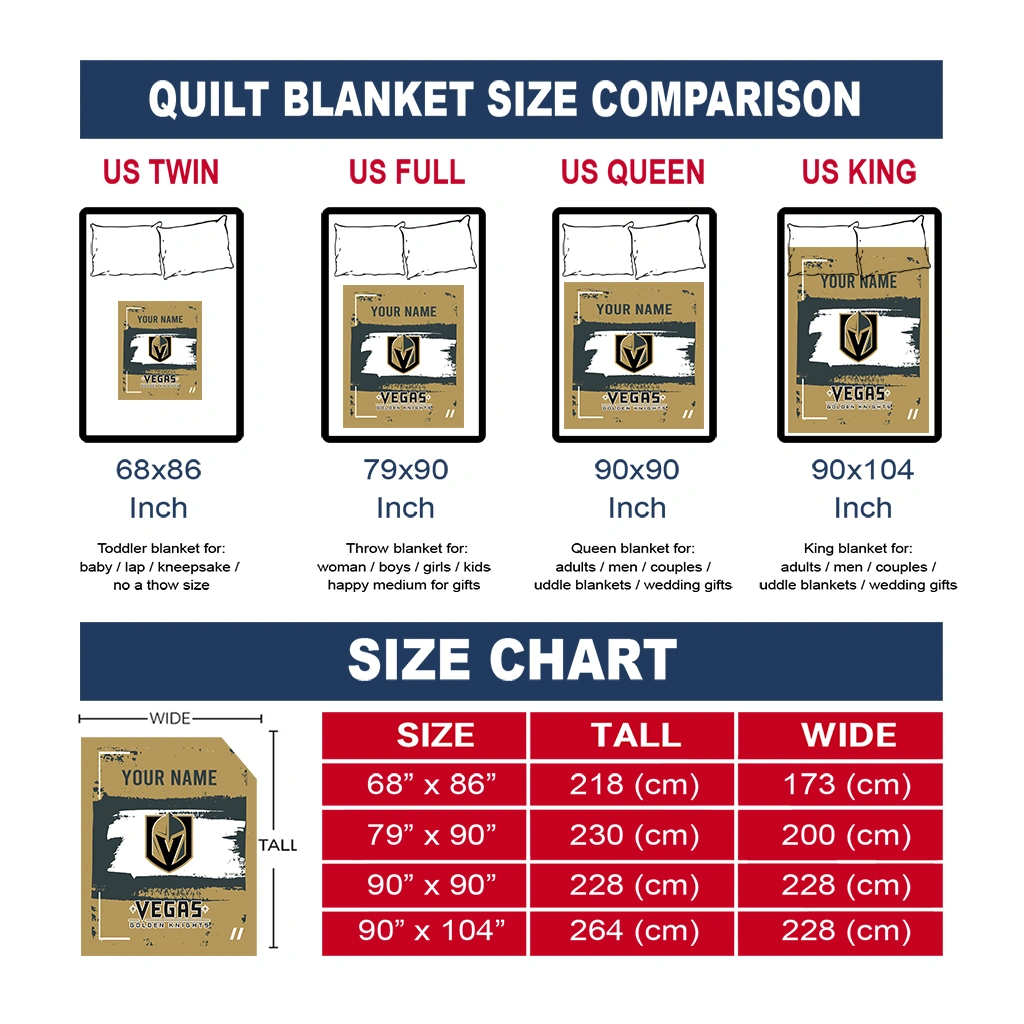 Wrap yourself in warmth and pride with the Personalized Vegas Golden Knights Grunge Patch Tan White Quilt Blanket from the Vegas Golden Knights Blankets collection at Yes That Blanket. Made from 100% premium quilting-weight polyester blended with a touch of microfiber, this quilt offers a smooth, soft finish you’ll love. Choose between two quilting styles—Stipple or Diagonal—and enjoy the comfort of a cotton-filled layer inside that adds extra coziness for every season. The border is available in classic black or white, giving your design a clean, timeless edge.