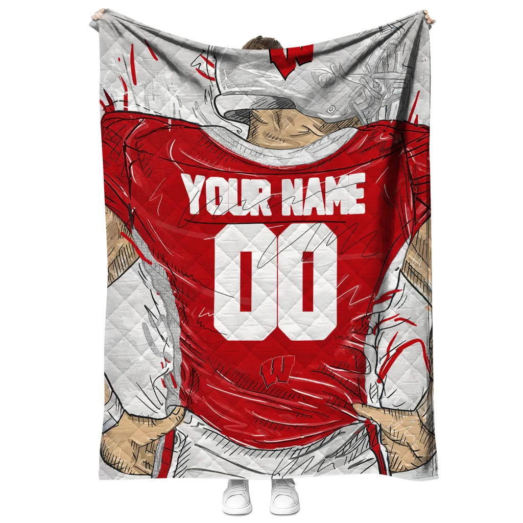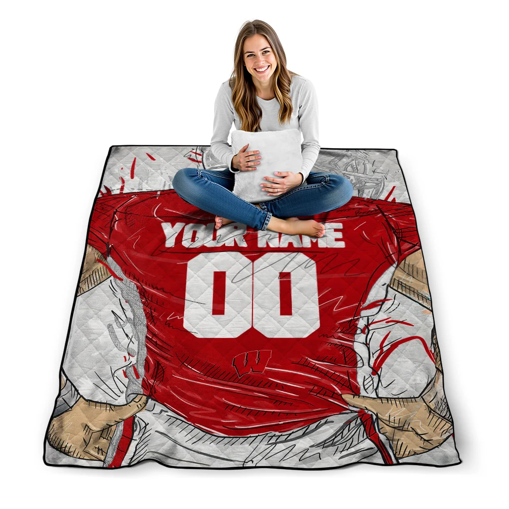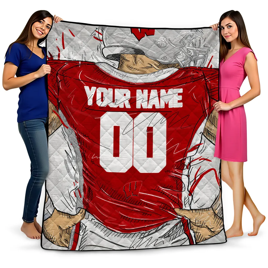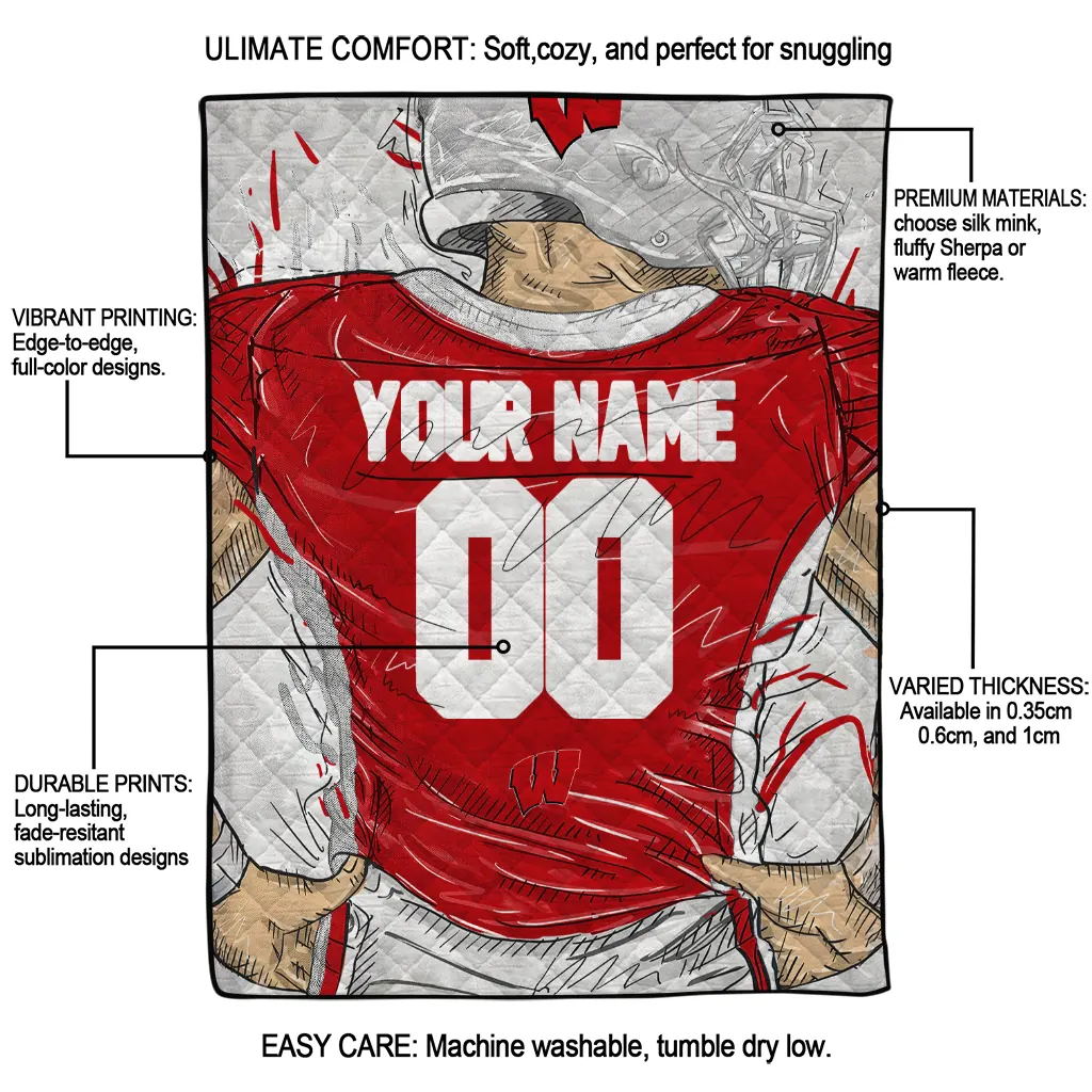 Personalized Wisconsin Badgers Player Sketch Red Gray Quilt Blanket