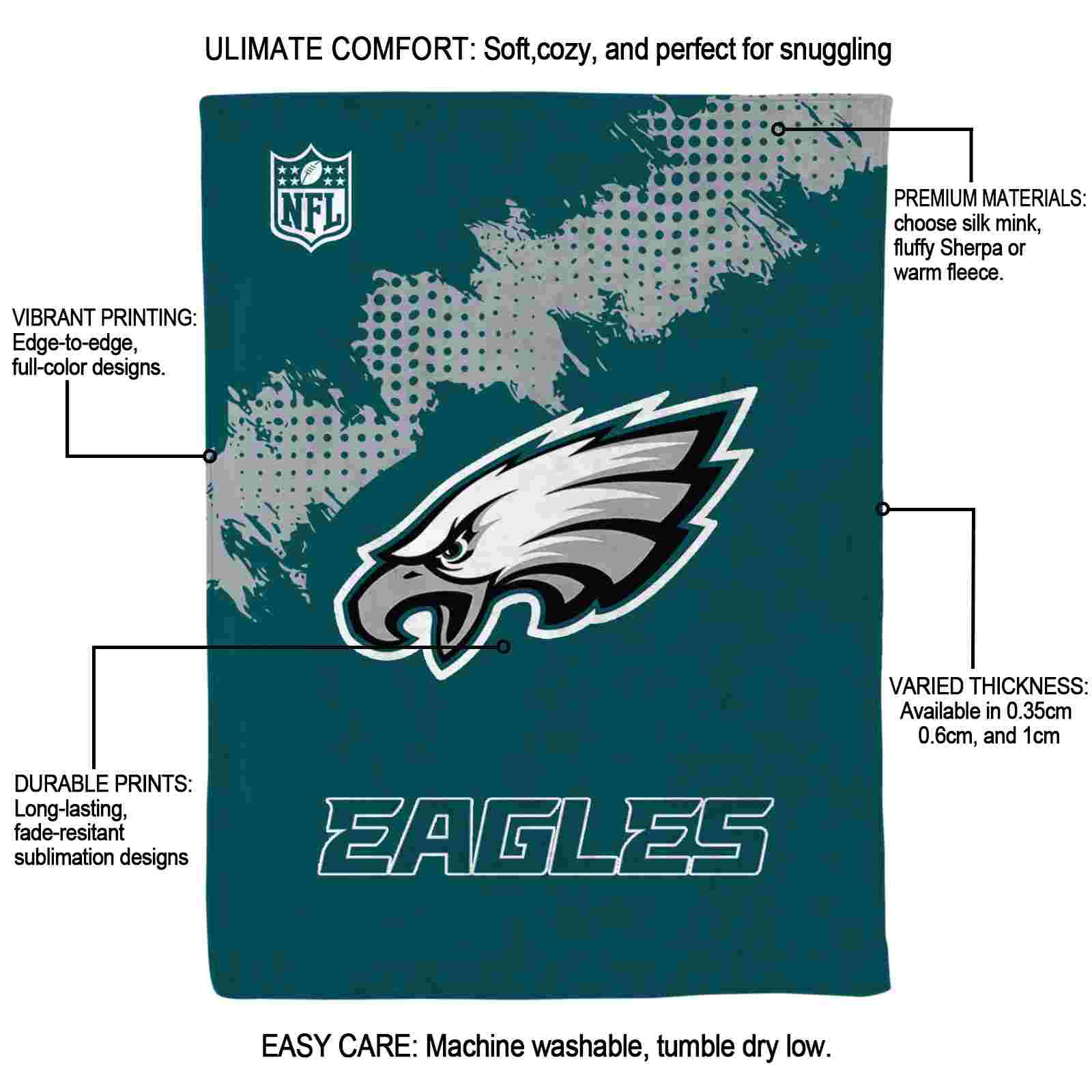 Without a doubt, the Philadelphia Eagles Grunge Texture Green Blanket from Philadelphia Eagles Blankets collection is offering true fans a chance to showcase passion in a cool way. Personalize it with your favorite team’s logo or a meaningful name to make it uniquely yours. Isn’t that great? The full-color print ensures vibrant, edge-to-edge designs, bringing your sports enthusiasm to life!