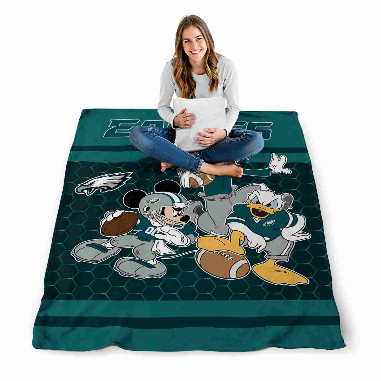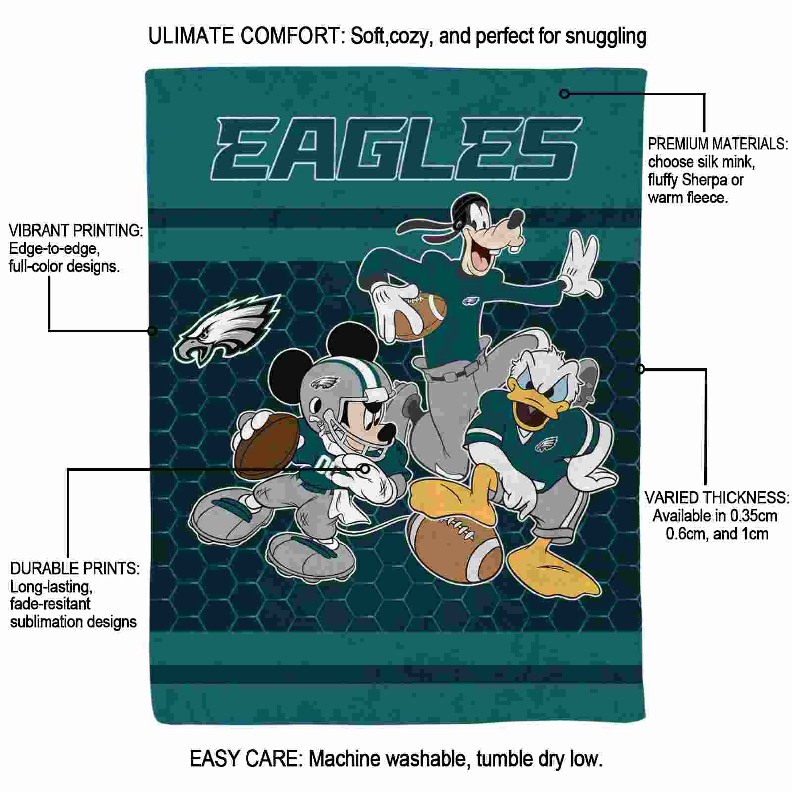 The Philadelphia Eagles Three Musketeers Green Blanket isn’t just a blanket—it’s your connection to the game. Snuggle up while reliving legendary plays or dreaming of future championships. Its bold, team-inspired designs keep your love for the sport front and center, while its easy-care durability means it’s always ready for your next adventure. From cheering at home to showcasing your loyalty on the go, this item of NFL Blankets collection is made for fans who live and breathe the game.